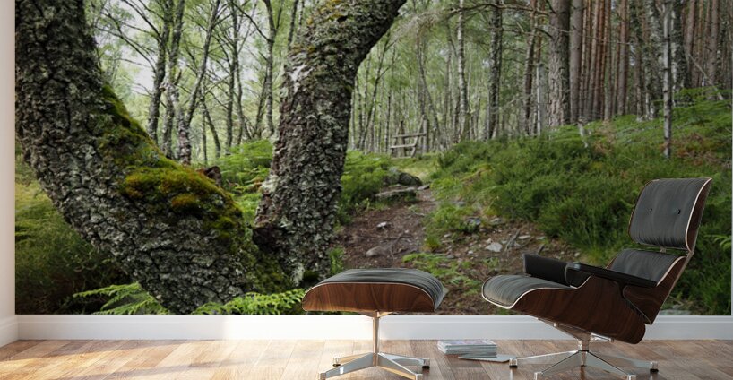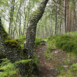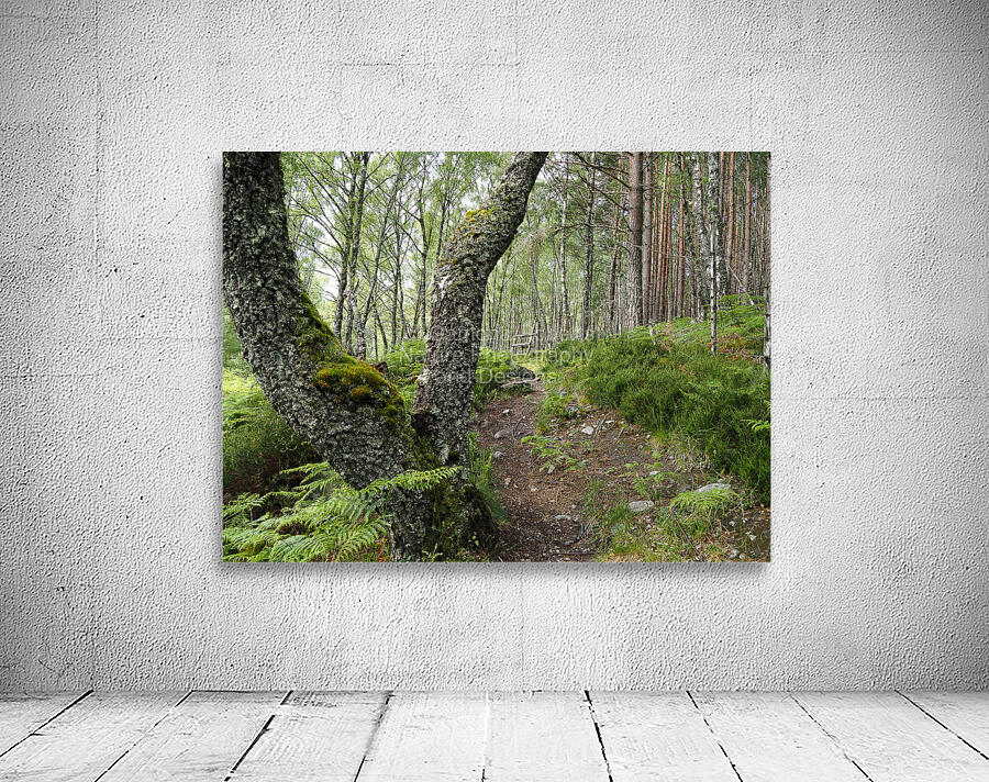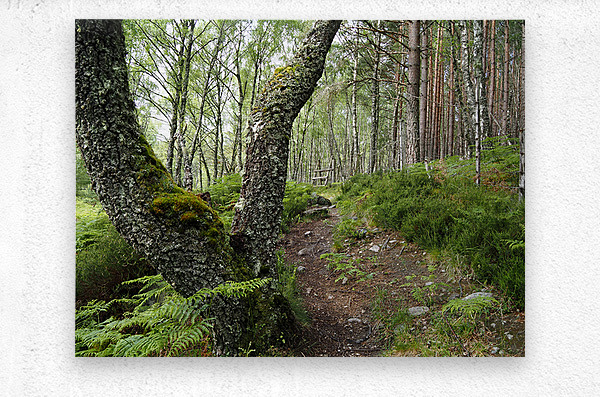 I took this photo during a lovely late spring nature walk through the Scottish Highlands. Features a winding dirt path meandering through a lush, green forest filled with tall Birch and Pine trees accompanied by dense undergrowth. Moss covers the bark of the twisted Birch Guardian tree in the foreground, adding to the vibrant and tranquil ambiance of the woodland scene.