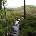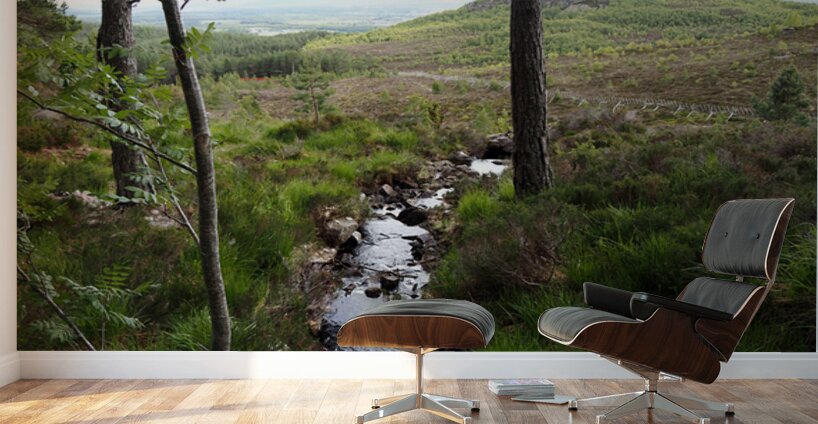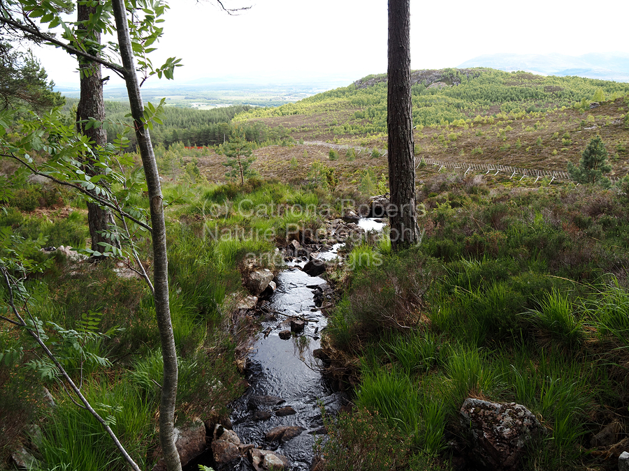 I took this photo during a lovely late spring nature walk through the Scottish Highlands. Features a narrow stream gently flowing through a lush, green landscape surrounded by trees. The distant hills and overcast sky create a serene and tranquil atmosphere