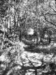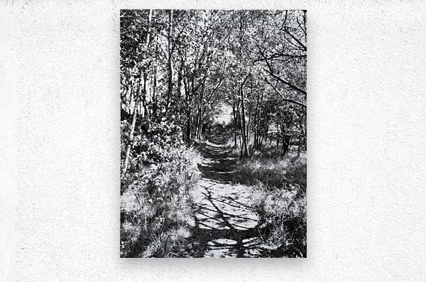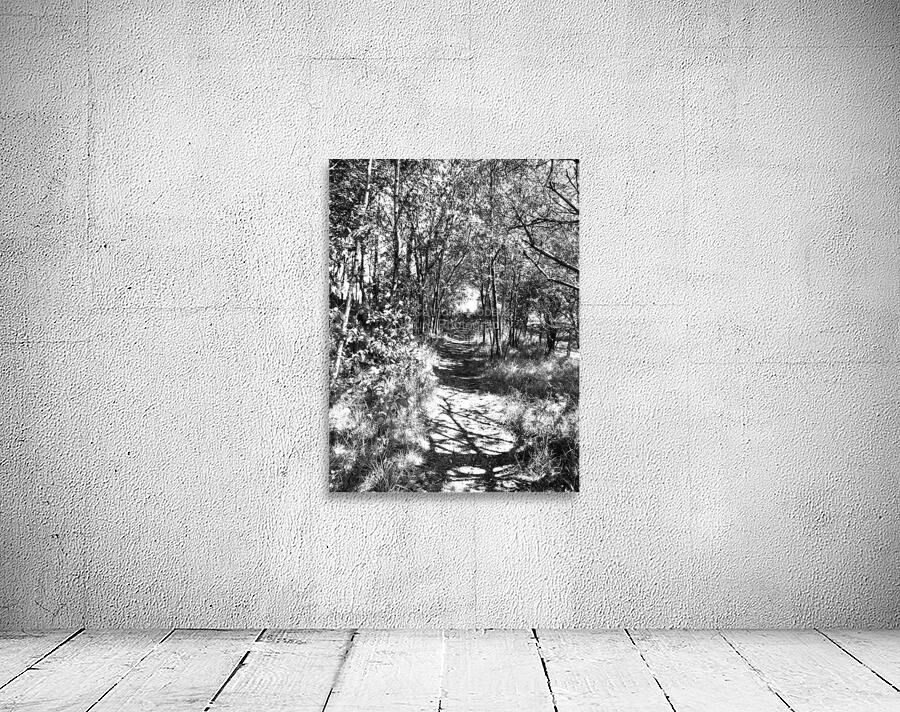 I took this photo (using a monochrome photographic filter which give a grainy effect) during a lovely late spring nature walk through the Scottish Highlands. Features a sun-dappled path winding through a wooded area, casting intricate shadows on the ground. Tall Birch trees arch overhead, creating a canopy that filters the sunlight.