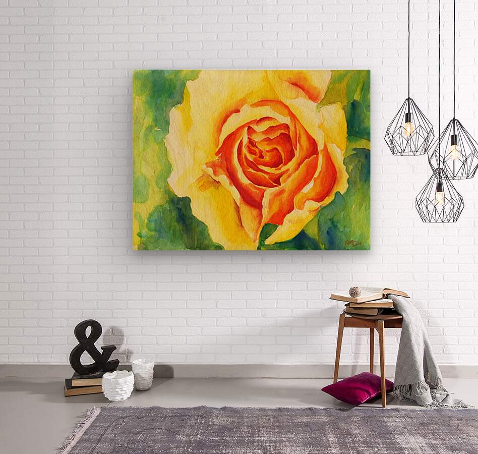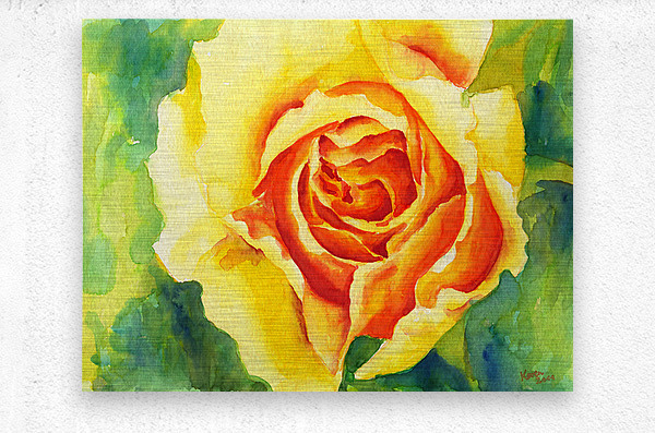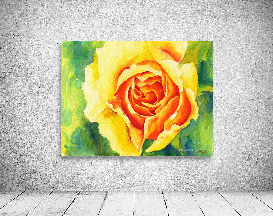 Yellow Rose is a watercolour painting in landscape format painted by the artist Karen Kaspar. A beautiful rose blossom in shades of bright yellow and orange on a green background spreads its fragrance in this watercolour painting. Rose blossoms captivate every garden visitor with their delicate petals in different colours and their irresistible fragrance - a pleasure for all the senses. The eyes are enjoying the bright colours and the various shapes of the petals. Then the sweet scent of the flowers is fascinating not only the human being, but also the bees and butterflies and many other little insects. A rose is a delight for all senses and loved and admired by artists, poets, gardeners, fashion designers and lovers. Enjoy!