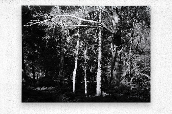 I took this photo during a lovely summer nature walk through the Scottish Highlands. Features sunlight filtering through the dense canopy, highlighting the trunks and branches of the trees in this serene mixed forest scene. The contrasting light and shadows create a dramatic, monochromatic effect.