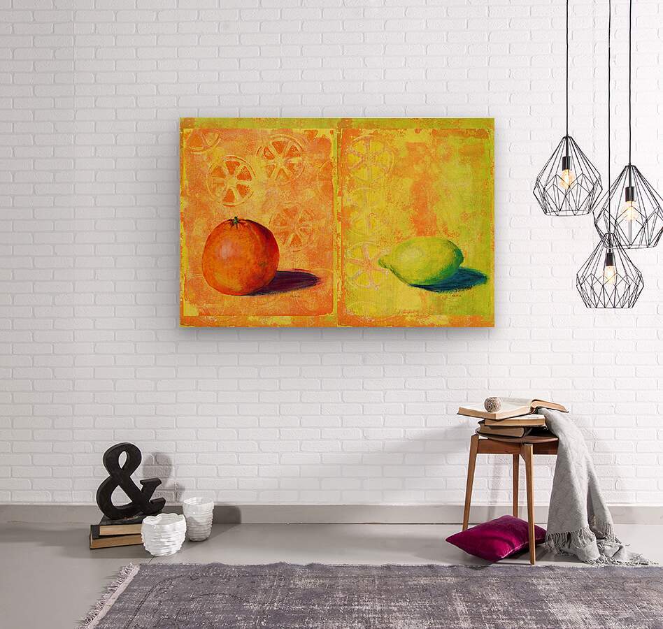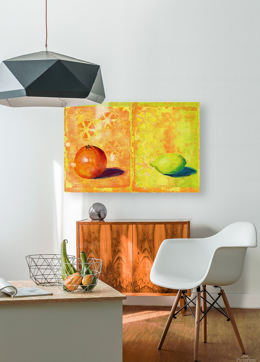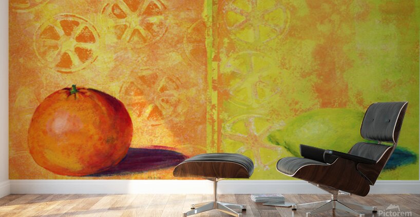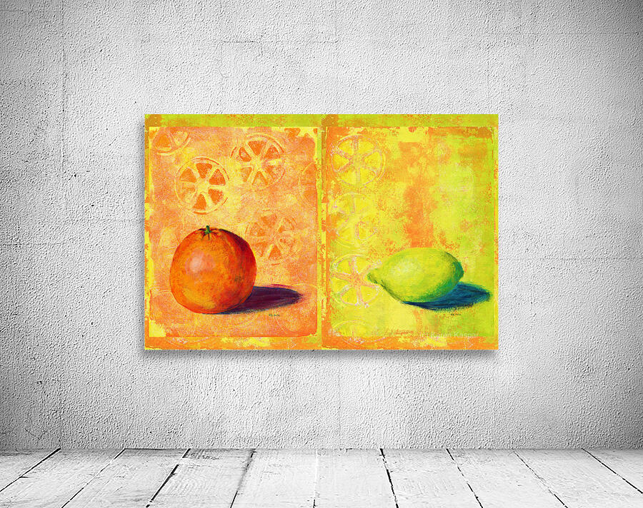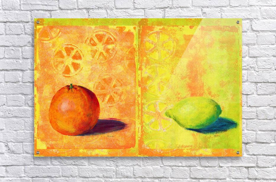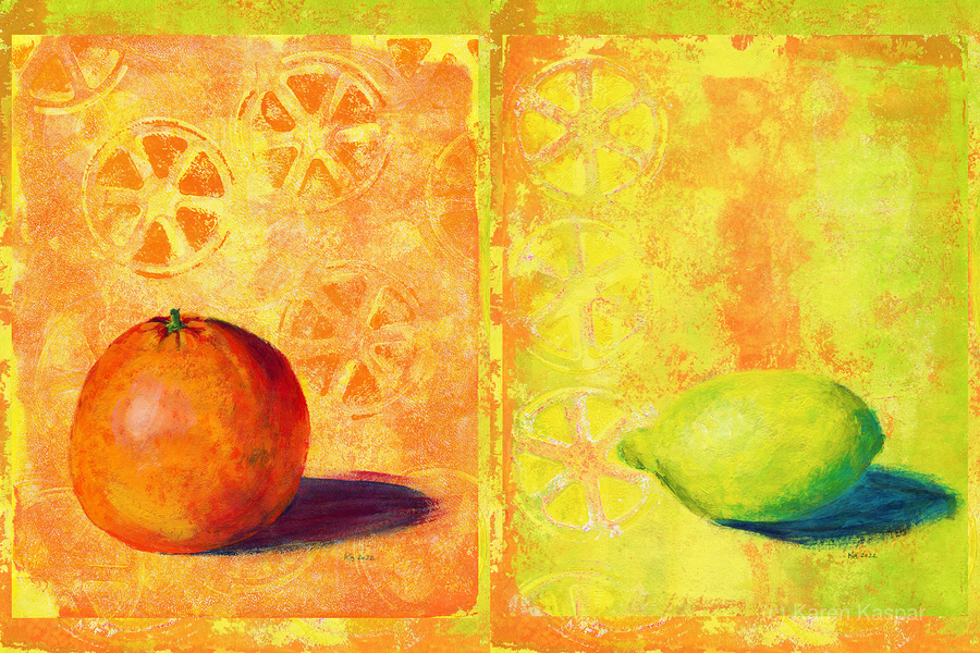 Fresh and juicy is a hand-painted acrylic painting by artist Karen Kaspar in landscape format. The painting is a combination of two individual paintings "Dreams of Orange Juice" and "Dreams of Lemonade" set against a textured citrus background. A single fresh juicy orange and a single fresh juicy lemon are dreaming of becoming delicious lemonade. The orange and lemon are realistically painted in fresh, bright orange, yellow and green. The background in yellow and orange tones is abstract and you can recognise the orange and lemon slices. The playful use of colour and the repetition of citrus cross-sections make for a lively and refreshing visual experience - a summer painting full of light, energy and bright fresh colours. 752