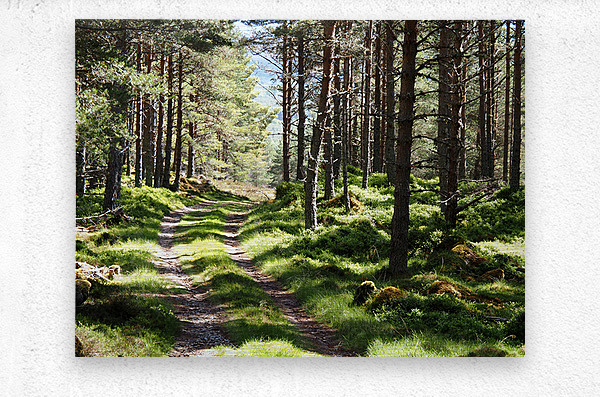 I took this photo during a lovely spring nature walk through the Scottish Highlands. Features sunlight filtering through tall Pine trees lining a narrow dirt path, casting dappled shadows on the lush greenery. The serene forest scene invites exploration and a sense of peaceful solitude.