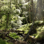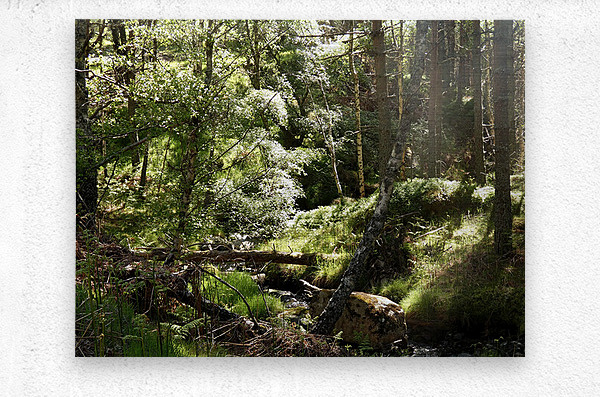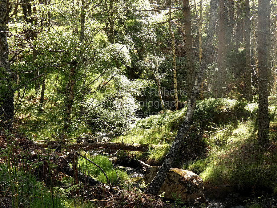 I took this photo during a lovely summer nature walk through the Scottish Highlands. Features sunlight filtering through a dense forest, highlighting the lush greenery and a gentle stream that winds its way through the trees. Fallen branches and moss-covered rocks add to the natural, serene atmosphere of this woodland scene.