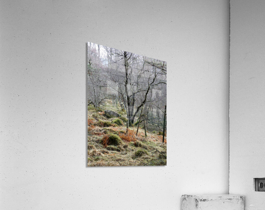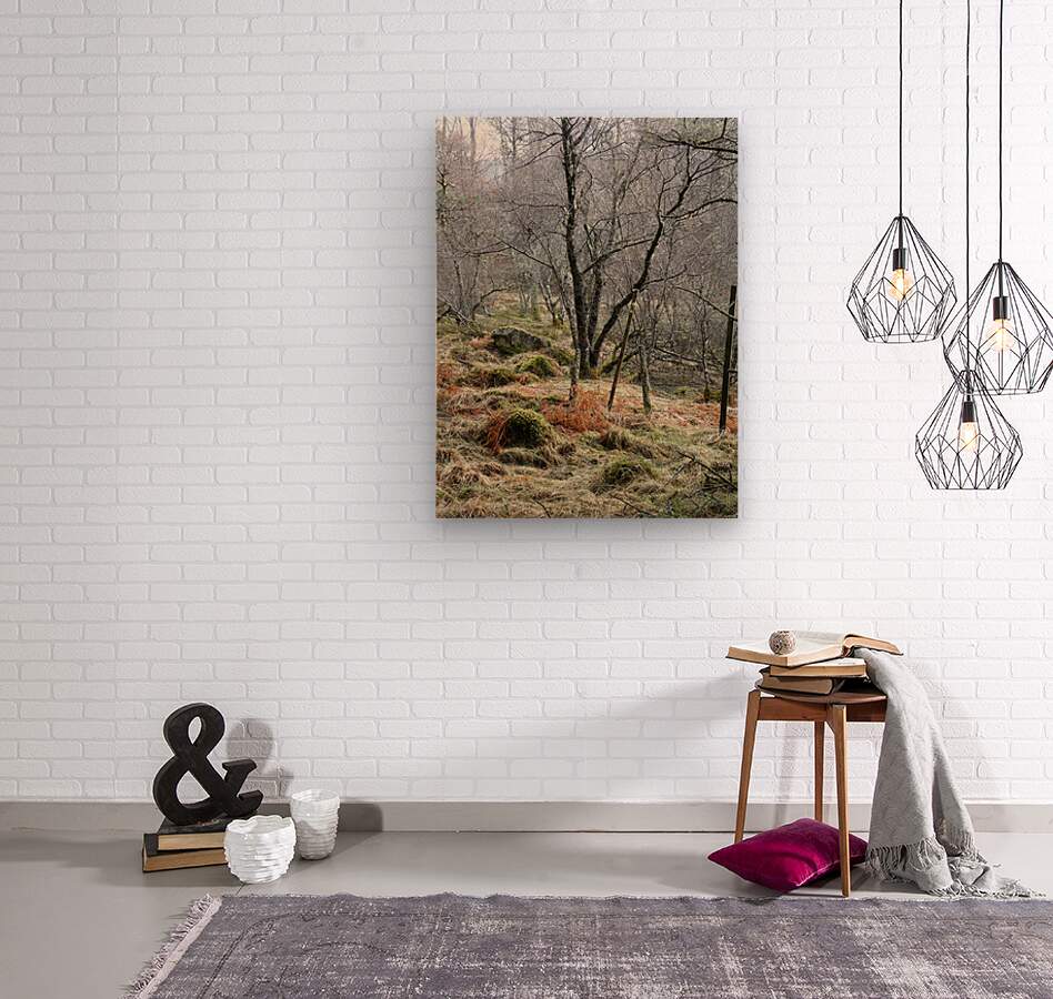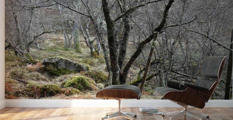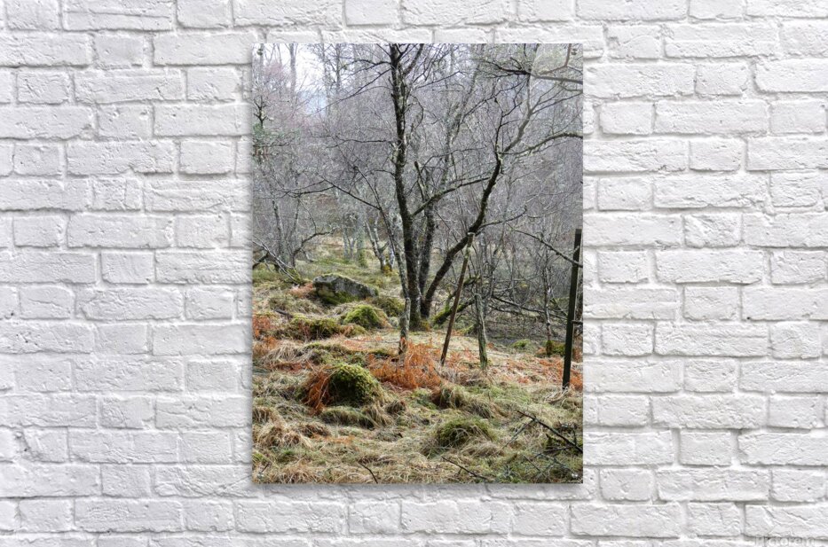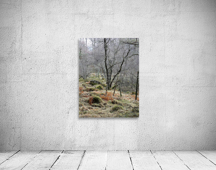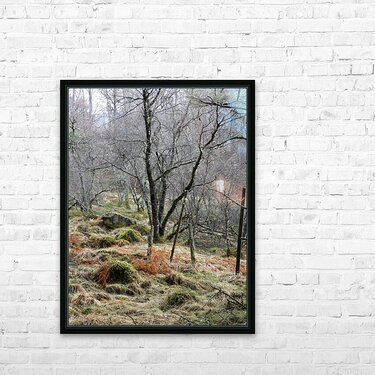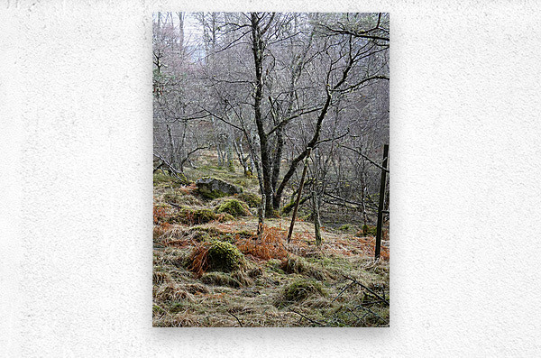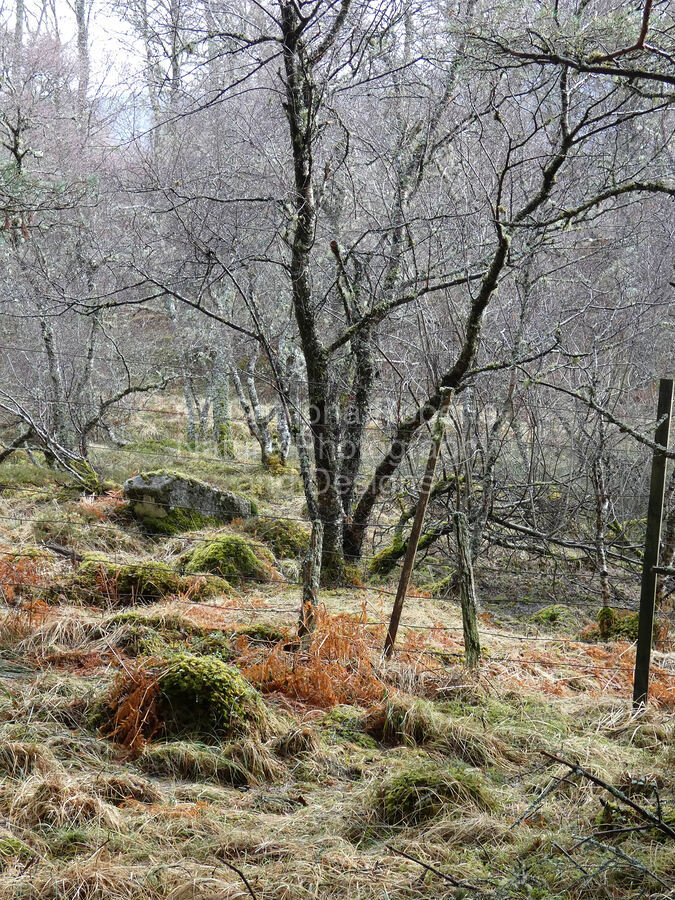 I took this photo during a lovely winter nature walk through the Scottish Highlands. Features a lone bent Birch Tree with rain droplets on it's branches, standing amidst russet ferns and moss covered rocks, while a Pine forest in the background looks on. The forest is densely packed with tall trees with branches covered in moss, creating a serene and misty atmosphere. The forest floor is blanketed with brown ferns and scattered rocks, adding texture and depth to the natural scene.