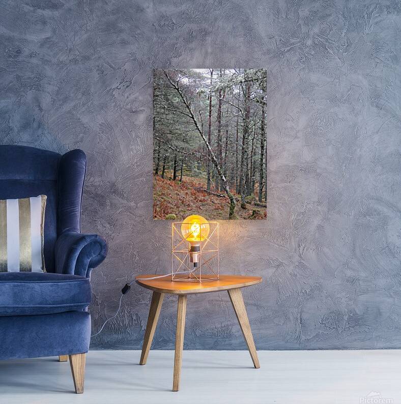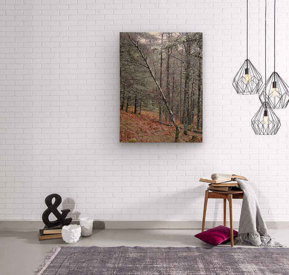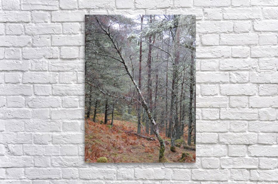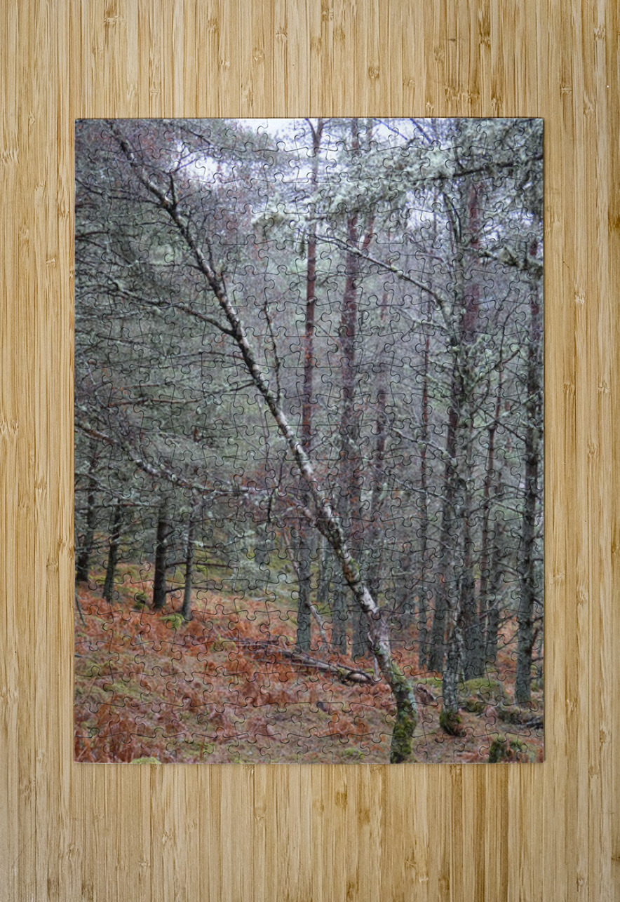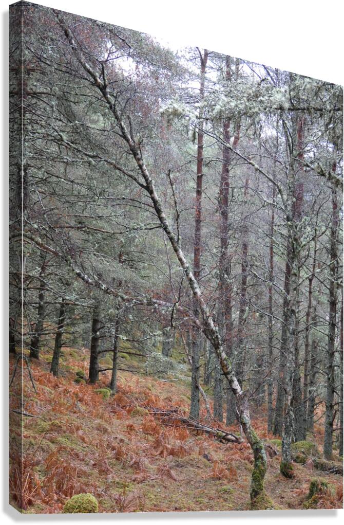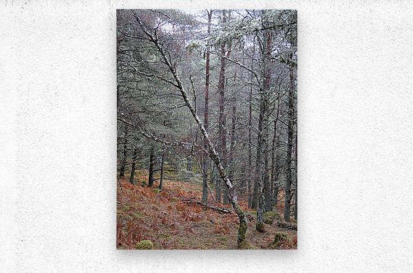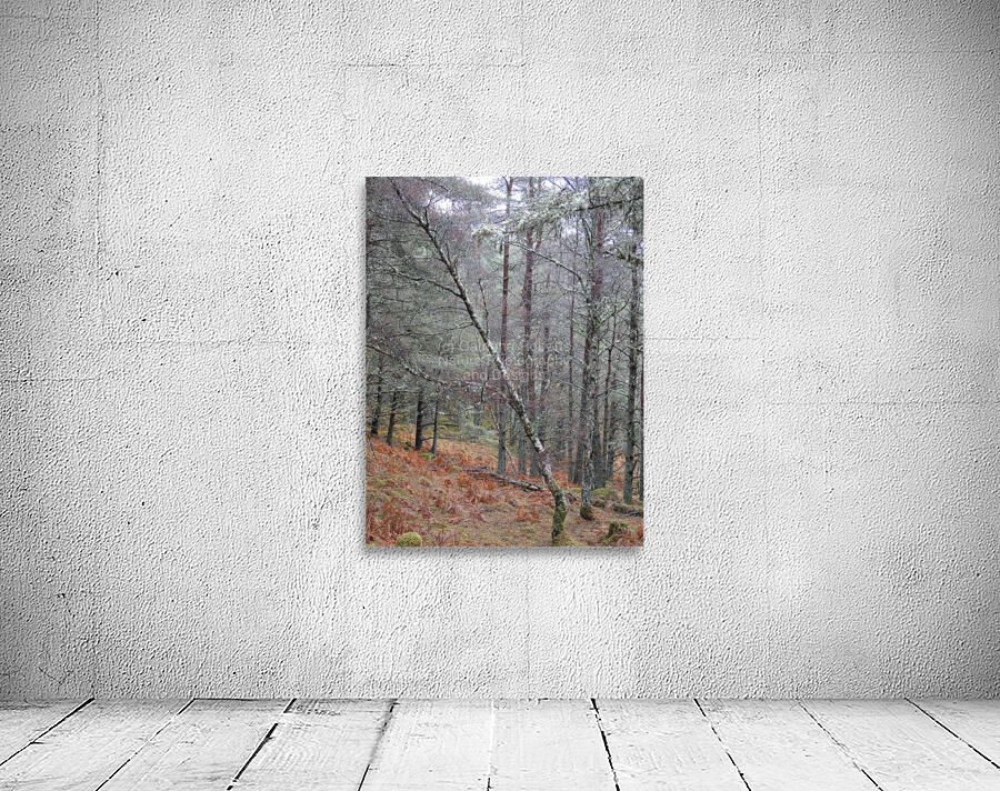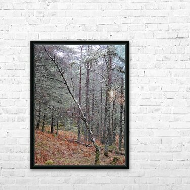I took this photo during a lovely winter nature walk through the Scottish Highlands. Features a lone bent Birch Tree with rain droplets on it's branches, standing amidst russet ferns and moss covered rocks, while a Pine forest in the background looks on. The forest is densely packed with tall trees with branches covered in moss, creating a serene and misty atmosphere. The forest floor is blanketed with brown ferns and scattered rocks, adding texture and depth to the natural scene.