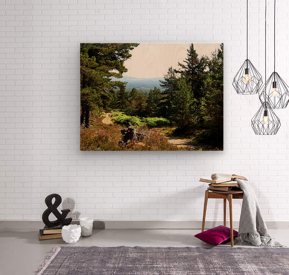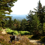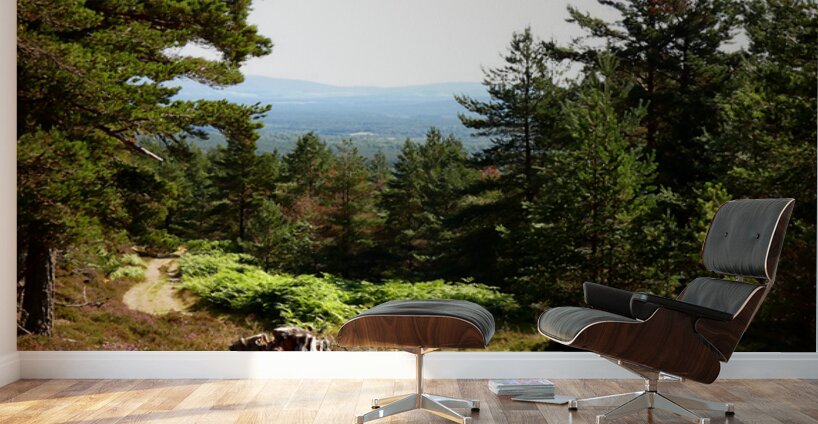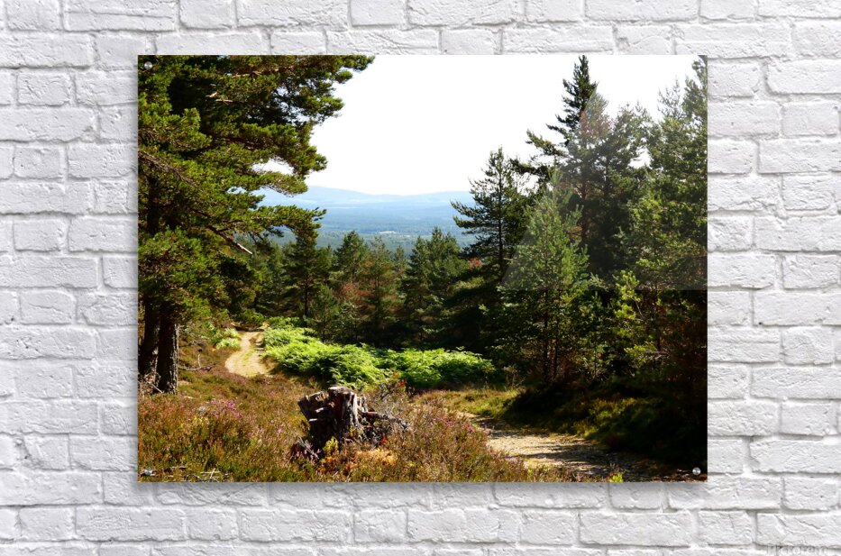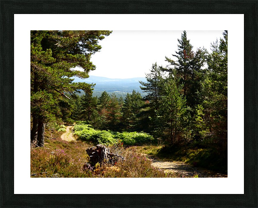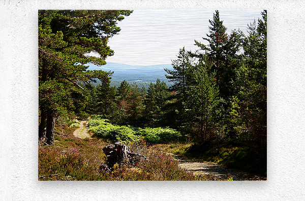 I took this photo during a lovely summer nature walk through the Scottish Highlands. Features a winding dirt path meandering through a dense forest filled with tall, lush green Pine trees. Sunlight filters through the canopy, highlighting patches of ferns and shrubs along the trail. In the distance, rolling hills stretch out under a clear sky.