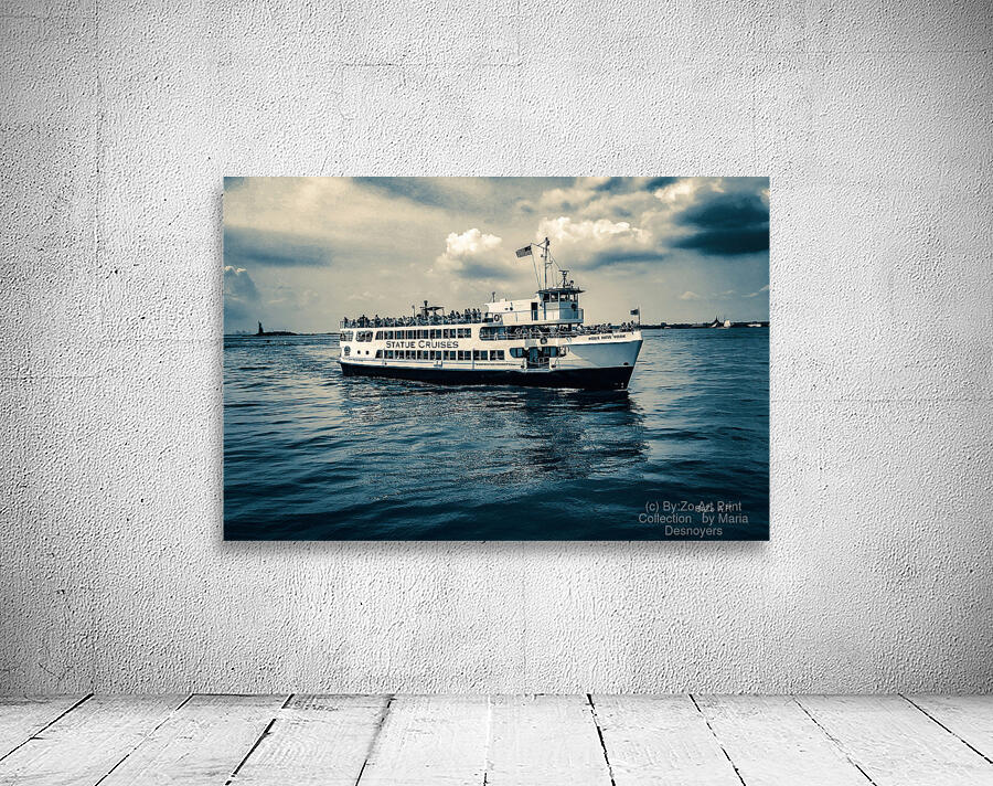 A boat filled with people is returning from a tour, and you can sense their excitement even from afar. The Statue of Liberty is in the background, adding a touch of history and significance to the moment. It's a mix of adventure and the comfort of coming back home. Original Photography by: Maria Desnoyers of ByZo Art