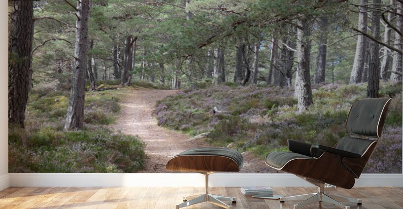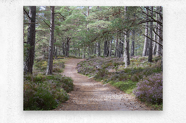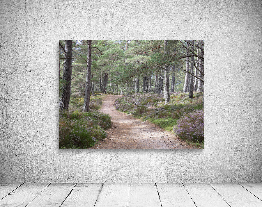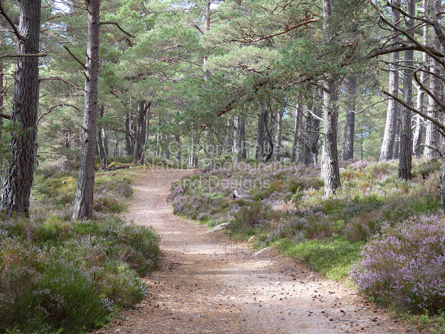 I took this photo during a lovely summer nature walk through the Scottish Highlands. Features a winding forest path cuts through a dense Pine woodland filled with tall trees and vibrant greenery. Purple heather blooms along the trail, adding splashes of color to the natural landscape.