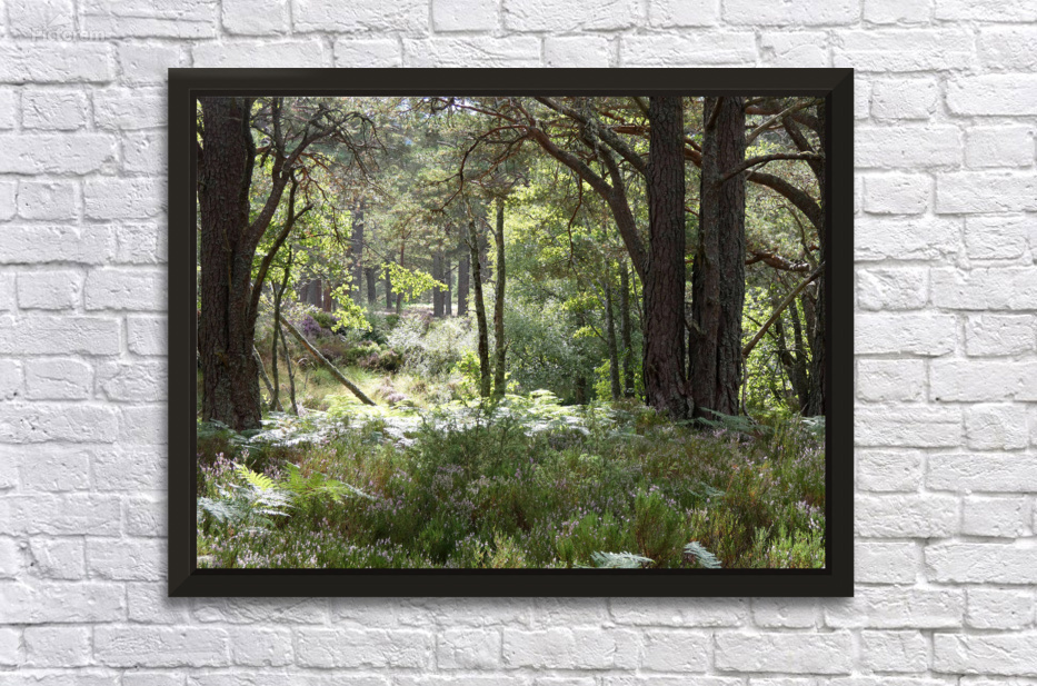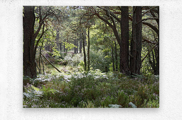 I took this photo during a lovely summer nature walk through the Scottish Highlands. Features sunlight filtering through the dense canopy of a serene forest, illuminating the lush undergrowth and varying shades of greenery. Tall Pine trees with textured bark stand proudly in the foreground among the ferns and low shrubs, while Birch trees stand quietly in the background.