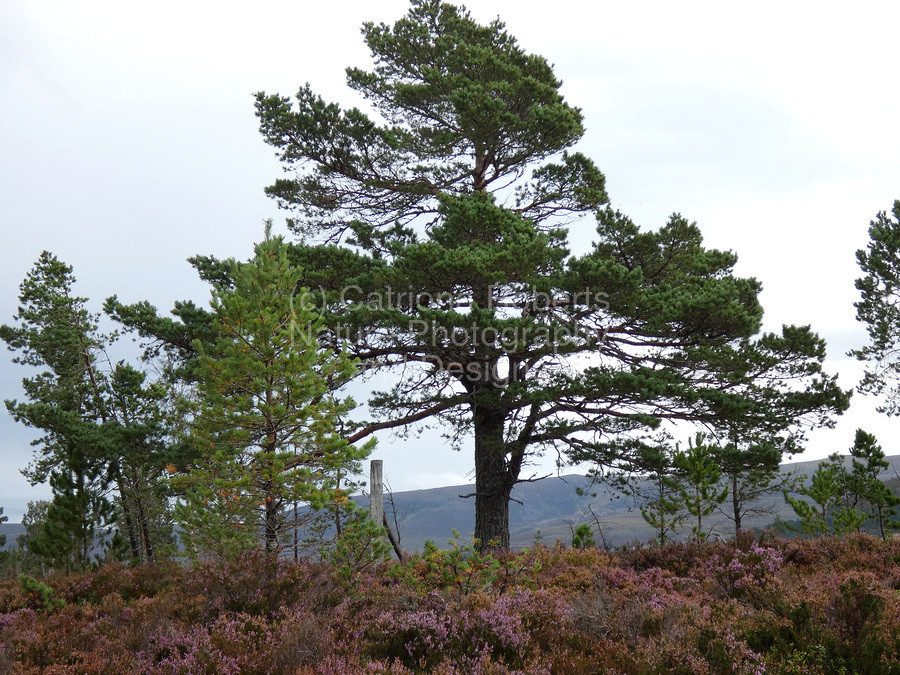 I took this photo during a lovely summer nature walk through the Scottish Highlands. Features a tall pine tree standing prominently against a cloudy sky, surrounded by heather and other trees. Rolling hills are visible in the background, adding depth to the natural scene.