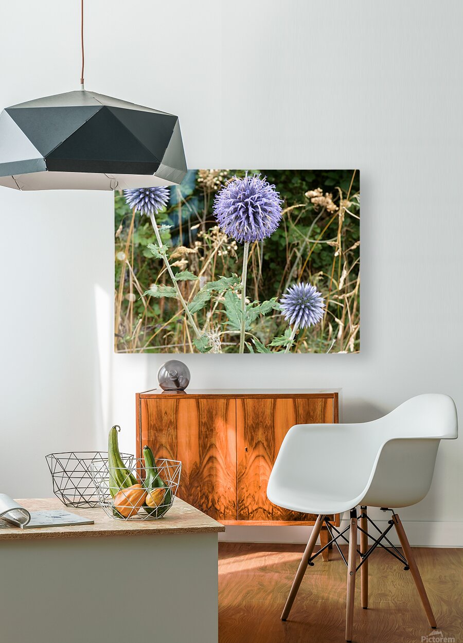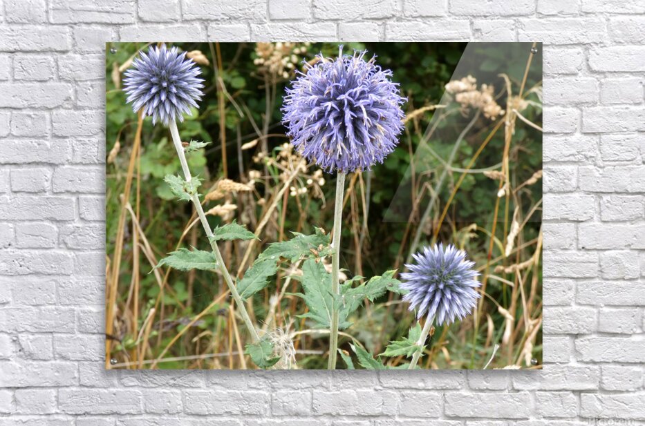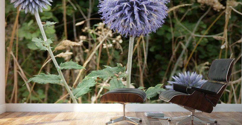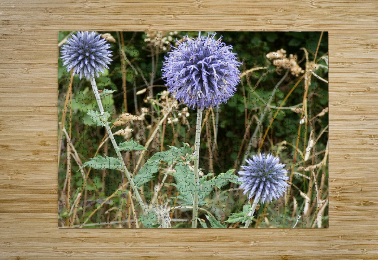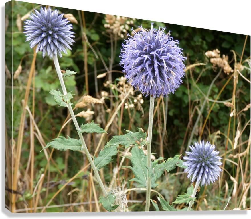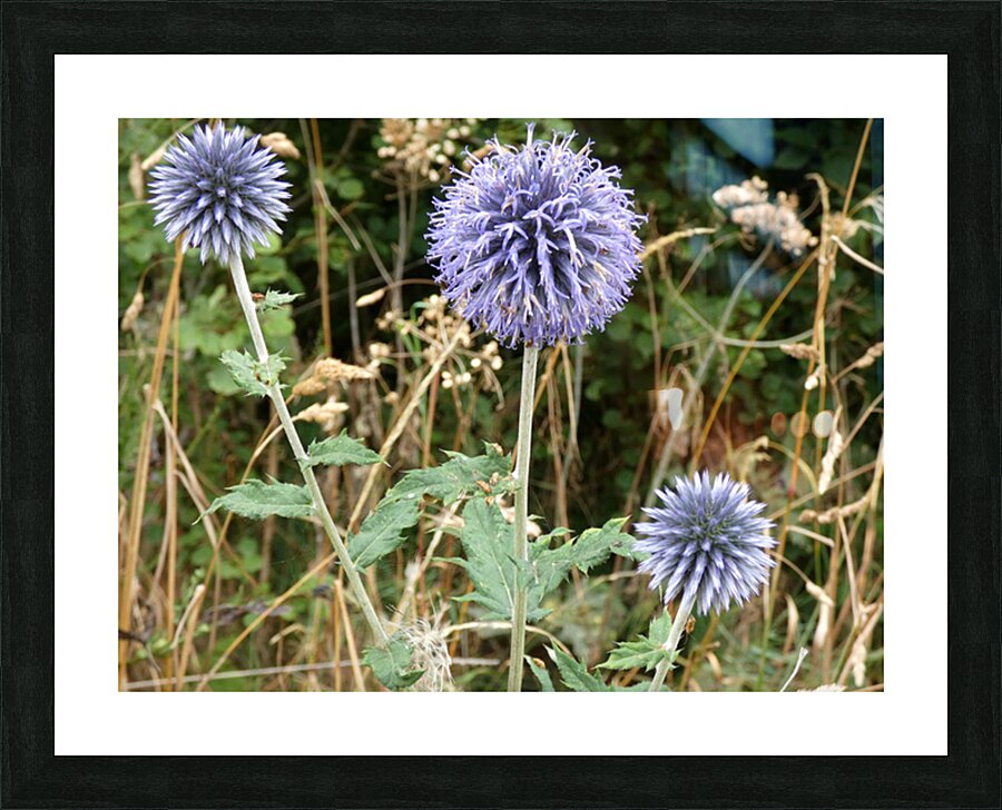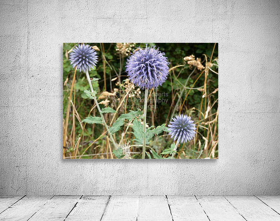 I took this photo during a lovely summer nature walk through the Scottish Highlands. Features purple globe thistles standing out against a backdrop of wild grasses and greenery. The spiky, spherical flowers capture the eye with their vibrant hue and unique texture.