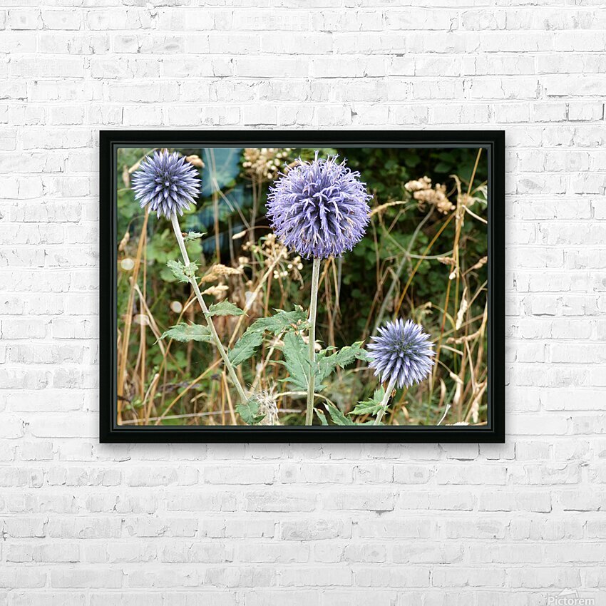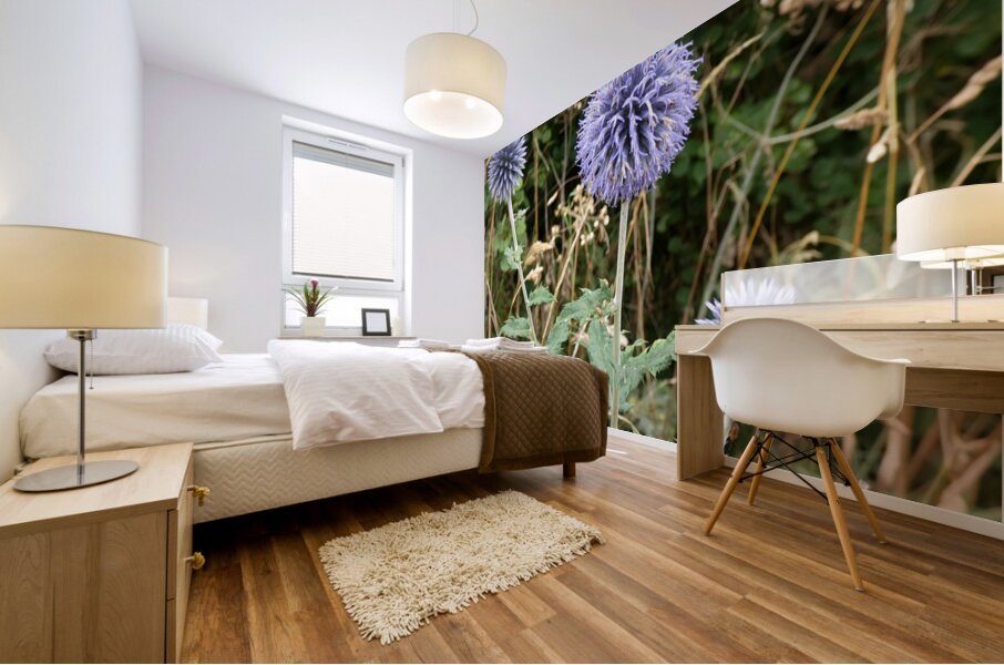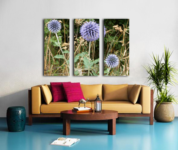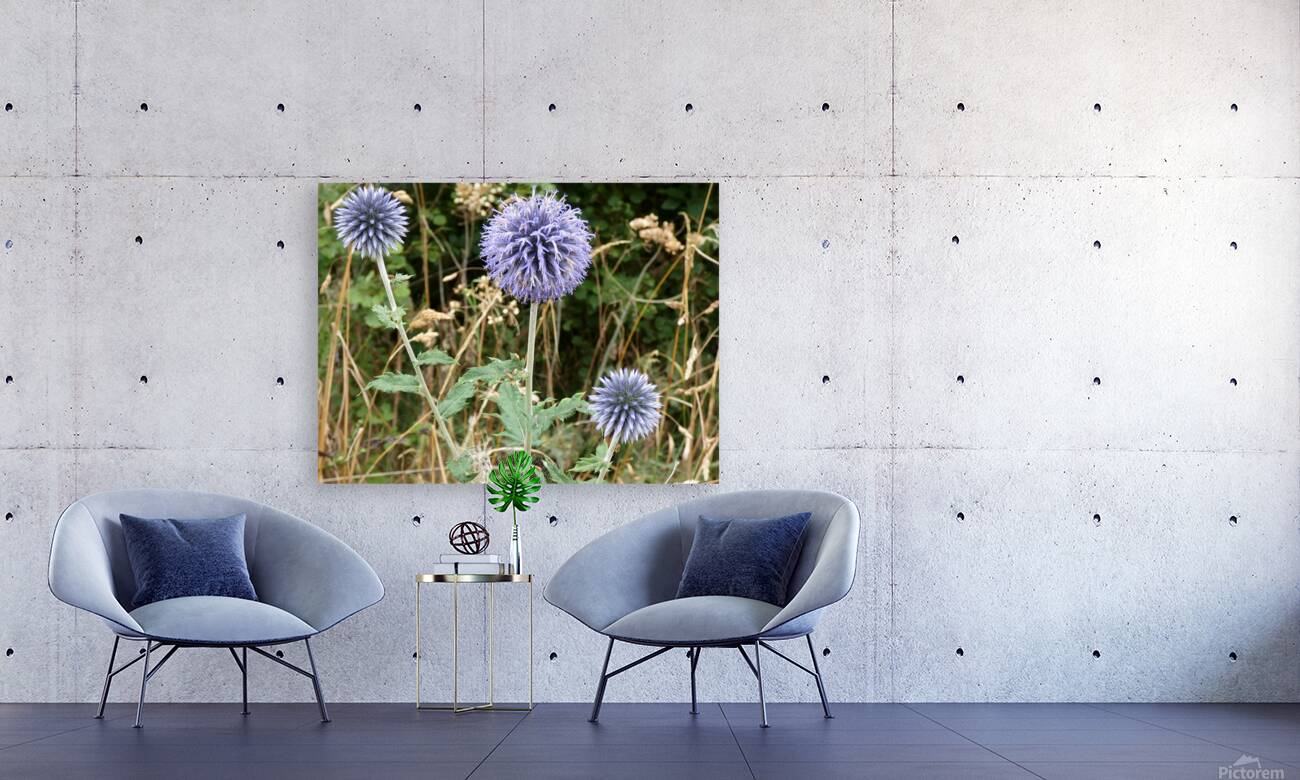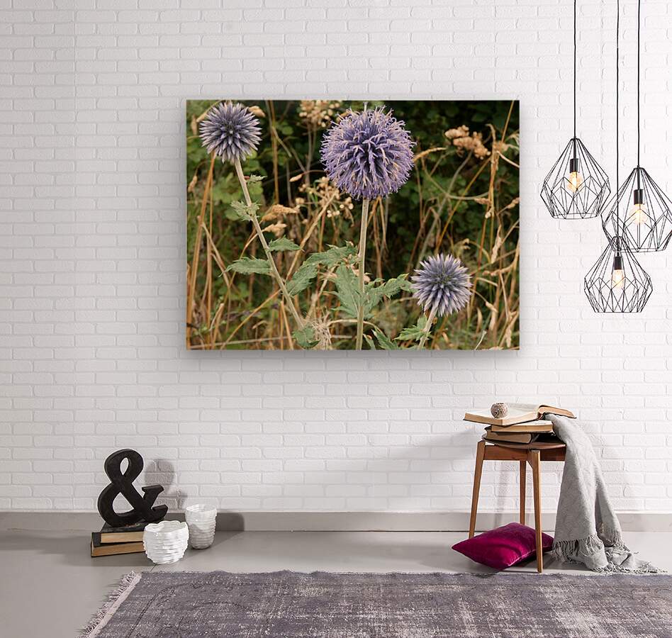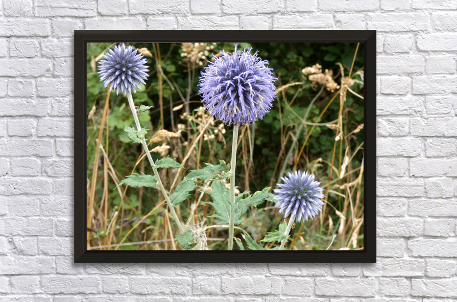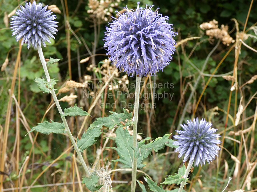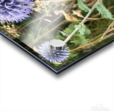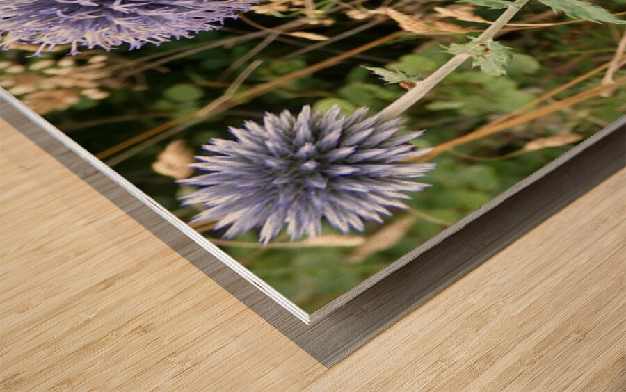 I took this photo during a lovely summer nature walk through the Scottish Highlands. Features purple globe thistles standing out against a backdrop of wild grasses and greenery. The spiky, spherical flowers capture the eye with their vibrant hue and unique texture.