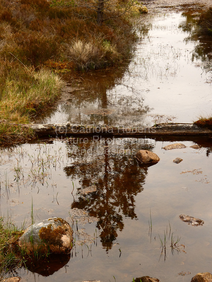 I took this photo during a lovely summer nature walk through the Scottish Highlands. Features a serene waterway reflecting the surrounding vegetation and trees, creating a mirror-like surface interrupted by a few rocks. The lush green grass and earthy tones of the foliage enhance the natural tranquility of the scene.