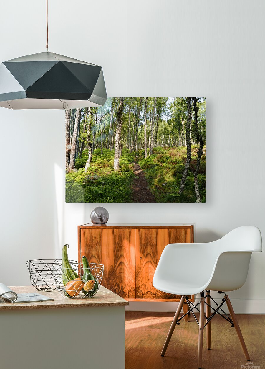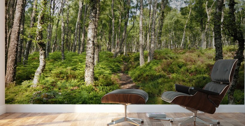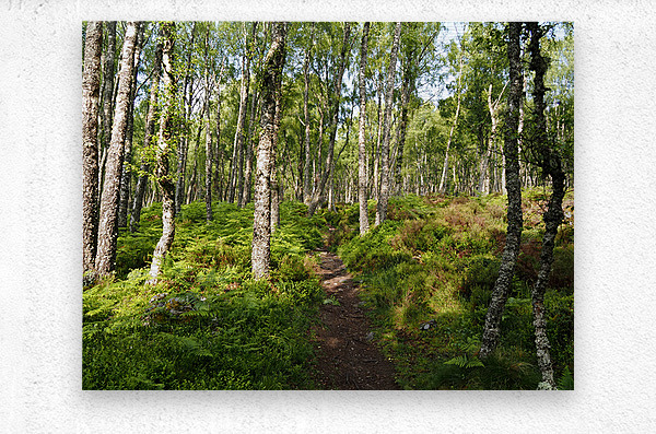 I took this photo during a lovely spring nature walk through the Scottish Highlands. Features sunlight filtering through a dense forest of slender Birch trees, casting dappled shadows on a narrow dirt path winding through lush green undergrowth. Ferns and moss add depth to the forest floor, creating a serene and inviting nature trail.