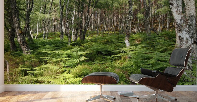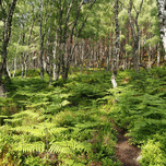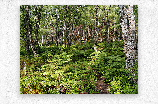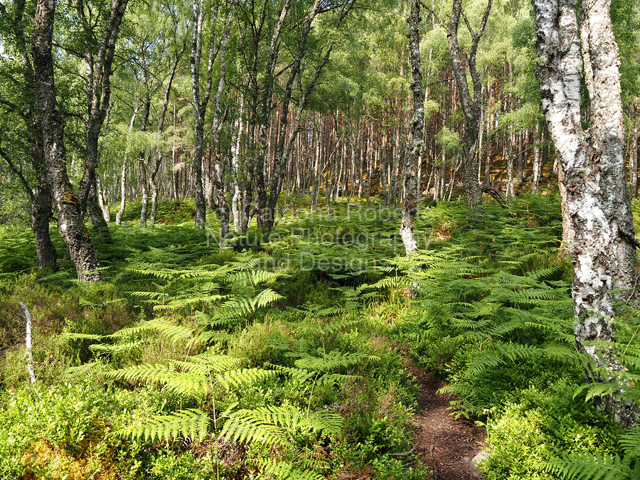 I took this photo during a lovely spring nature walk through the Scottish Highlands. Features sunlight filtering through a dense forest of birch trees, casting dappled light on a lush carpet of ferns and green undergrowth. A narrow path winds through the vegetation, inviting exploration of the tranquil woodland scene.