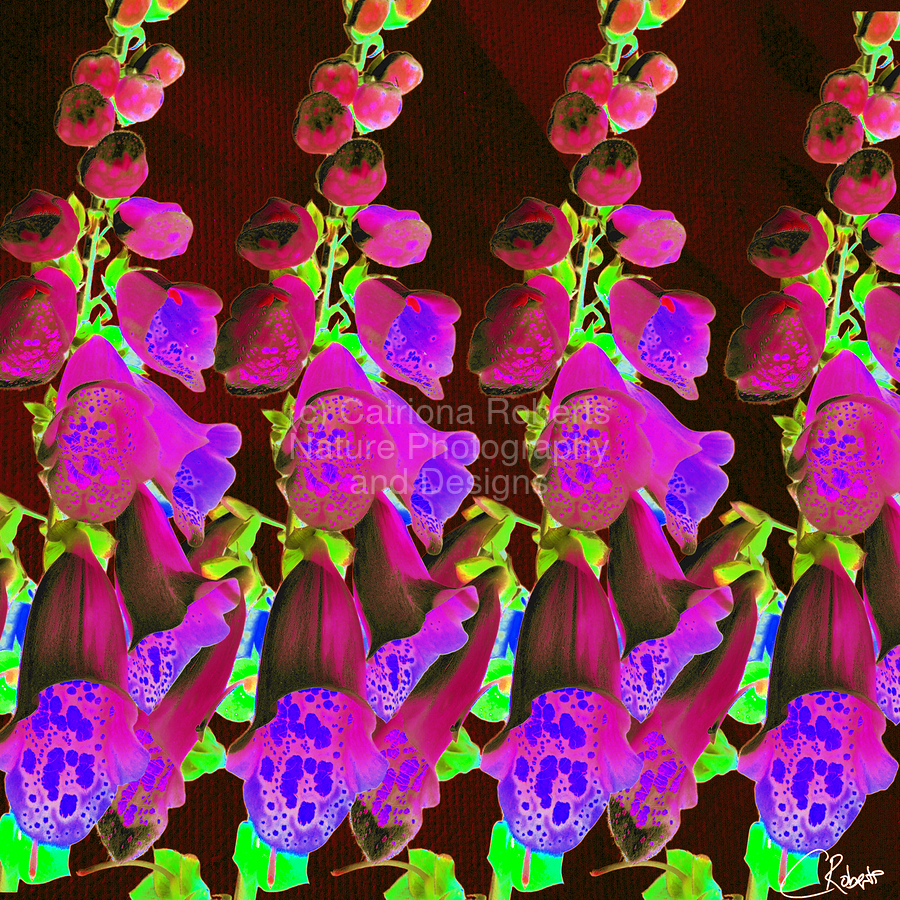 I took a close up photo of a foxglove and laterally digitally combined this with an acrylic abstract painting I made, ( using various means including the AI Magic Background Remover , duplication and layering options in Canva.com) to create a stunning piece of contemporary floral art. Features bright pink and purple flowers with green leaves creating a vibrant, repeating pattern against a dark background. The detailed floral arrangement showcases a variety of blooms in different stages of growth.