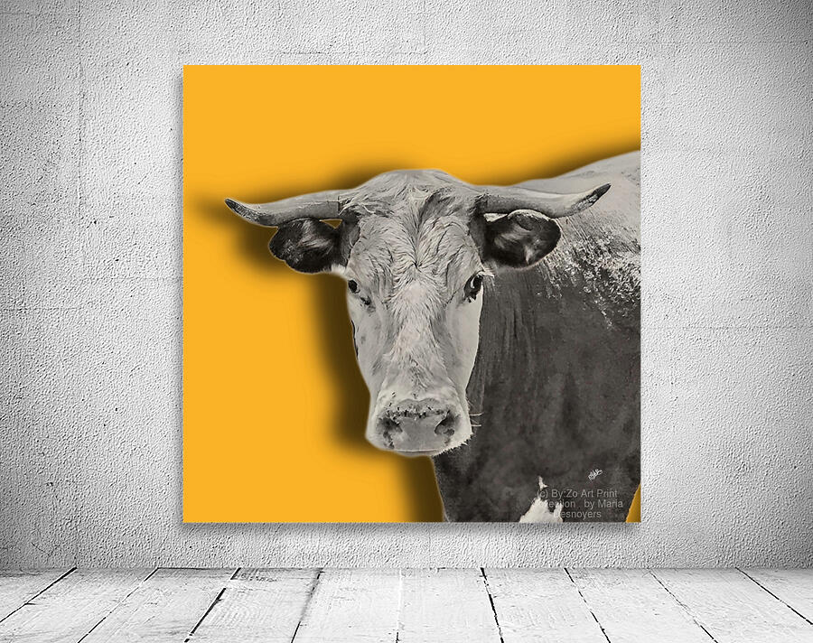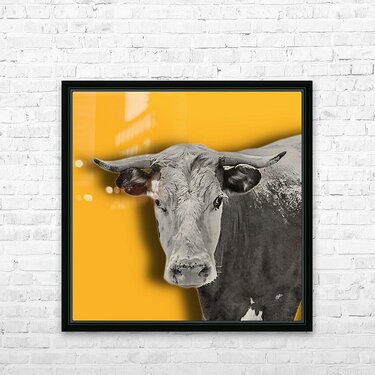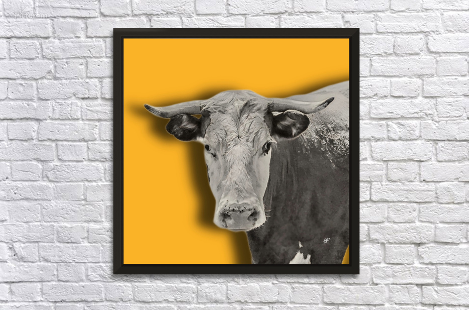 ABOUT THIS ARTWORK: FARM COW ORIGINAL ABSTRACT PHOTOGRAPHY ON DARK YELLOW BACKGROUND