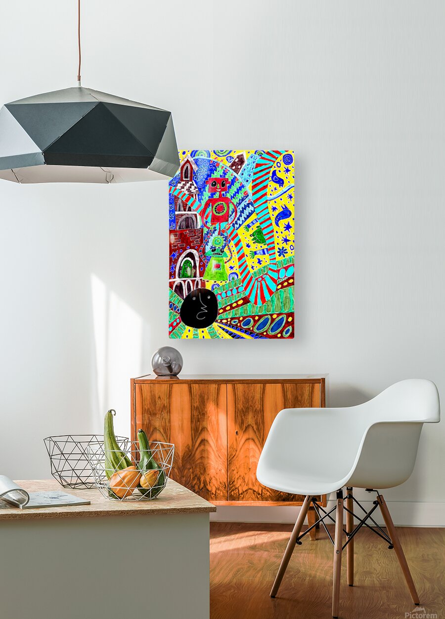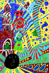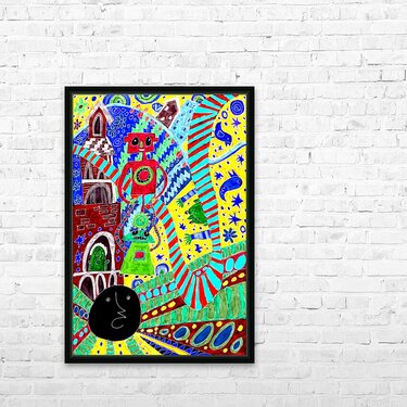 Originally a hand drawn design created using coloured ink pens and paper, laterally digitally colour enhanced to create an eye-catching piece of abstract art. Features vividly colored shapes and patterns which create a sense of dynamism, featuring abstract figures against an energetic backdrop. The combination of swirling stripes, stars, and geometric forms evokes a whimsical, dreamlike atmosphere.