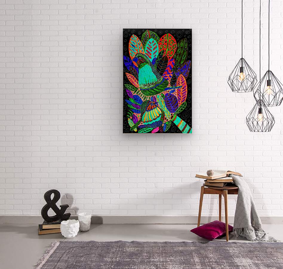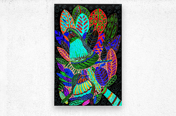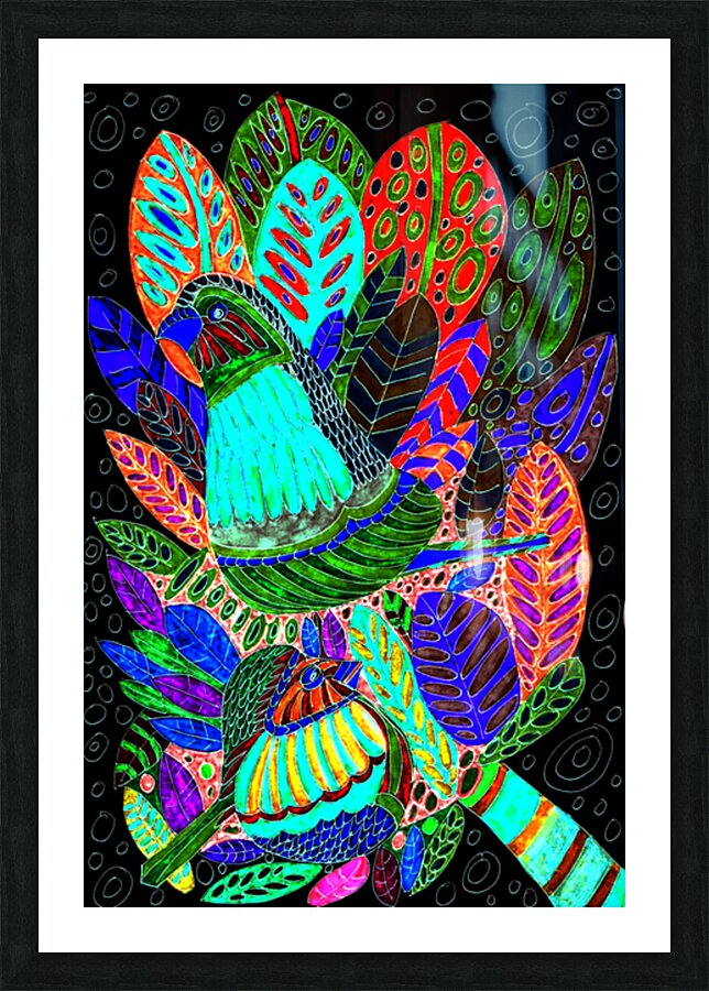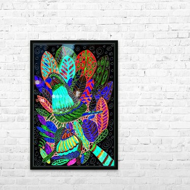 Originally a hand drawn design created using colour ink pens and paper. Features a vibrant array of colorful leaves forming the backdrop for two stylized birds, with their feathers intricately detailed in a variety of shades. The dark background accentuates the vivid colors and swirling patterns, creating a lively and energetic composition.