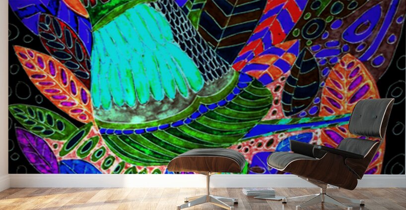 Originally a hand drawn design created using colour ink pens and paper. Features a vibrant array of colorful leaves forming the backdrop for two styli...[+]