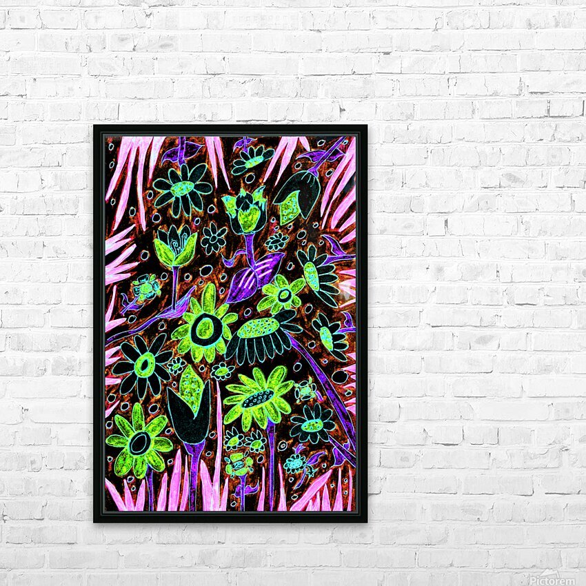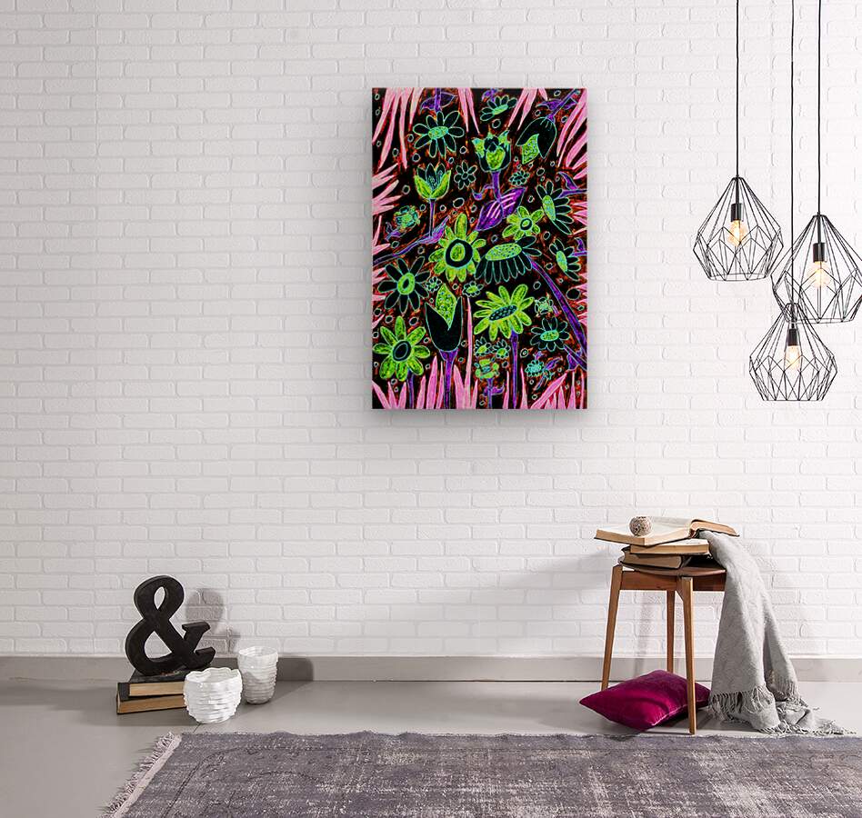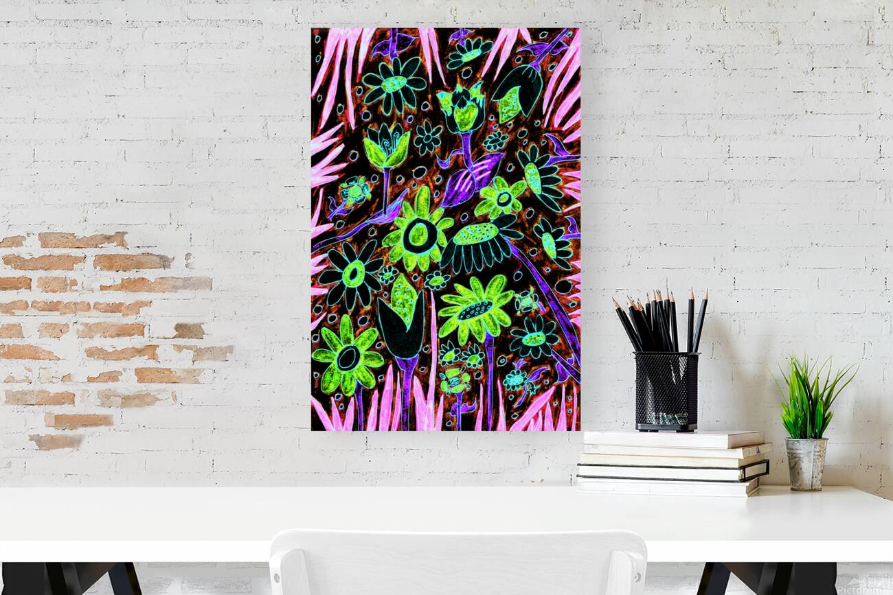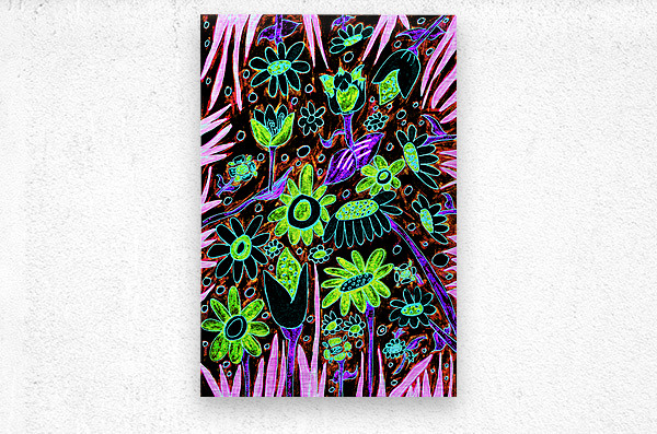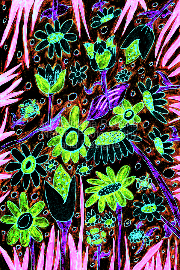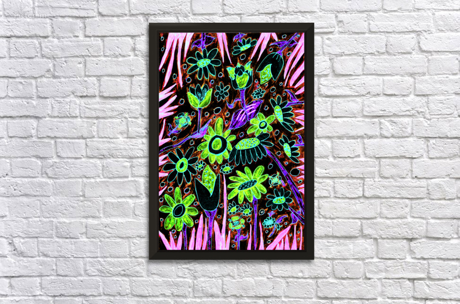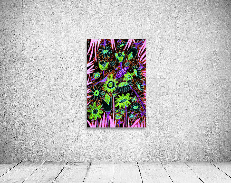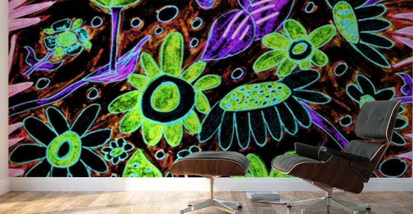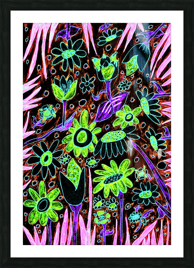 Originally a hand drawn design created using coloured ink pens and paper, laterally digitally coloured enhanced to create a stunning piece of contemporary floral art. Features a vibrant collection of abstract flowers bursting with neon pinks, greens, and purples against a dark background. The composition features a variety of flower shapes, petals, and leaves, creating a lively and whimsical garden scene.