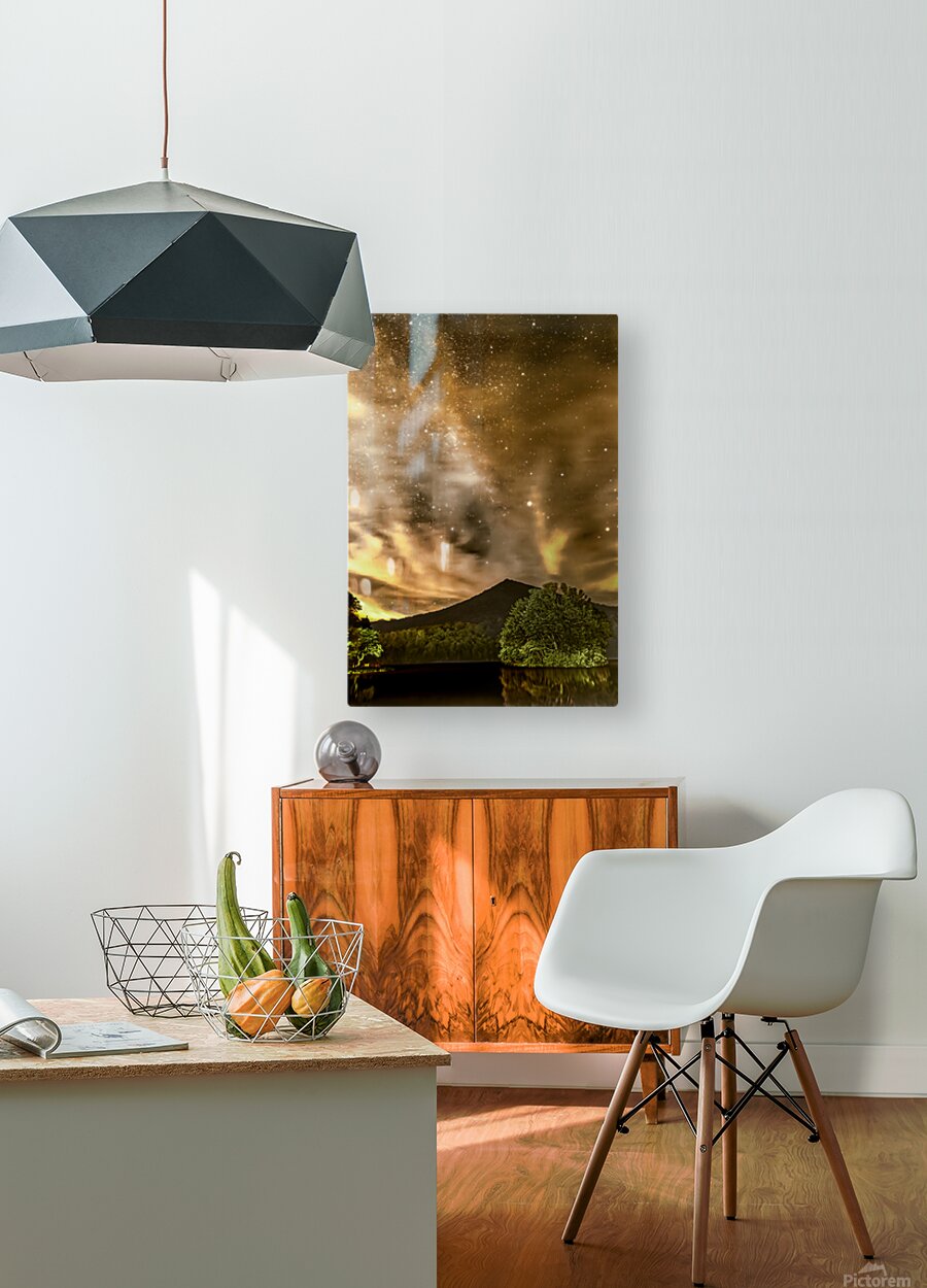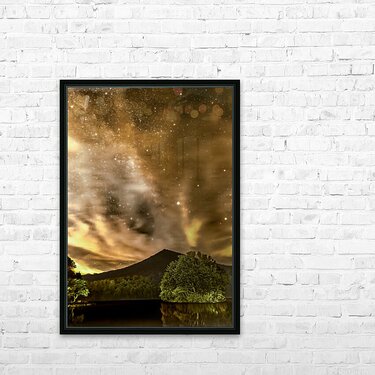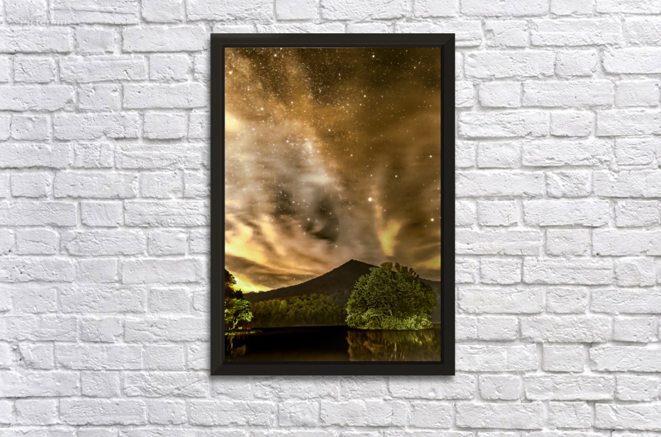The Peaks of Otter, located along the Blue Ridge Parkway in Virginia in Bedford, between Lynchburg and Roanoke, are renowned for their picturesque views and natural beauty. While there are many scenic overlooks along the parkway that offer wonderful daytime views, the Peaks of Otter can also present opportunities for witnessing unique and captivating lighting phenomena at mile post 86. At 2am the Milky Way Stars are interspersed among golden orange clouds. This unique coloring may have been the result of "Dirty Rain" Effect: In rare cases, weather systems can transport dust from distant regions, resulting in a phenomenon known as "dirty rain" that leaves a fine layer of sediment and can create unusual light refractions. What ever the cause the lighting was unusual and stunning. The Peaks of Otter Lodge is a favored location for capturing photos with Sharp Top Mountain serving as an excellent backdrop over Abbott Lake. It was 2am, but the clouds look like a stunning sunset or sunrise. Edited in a vertical format.