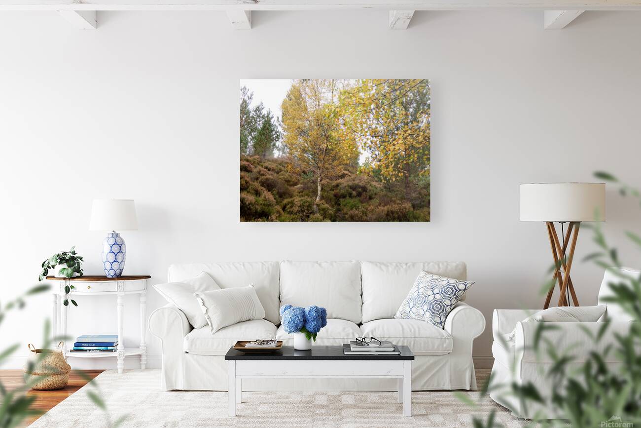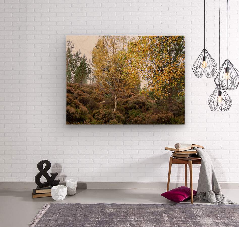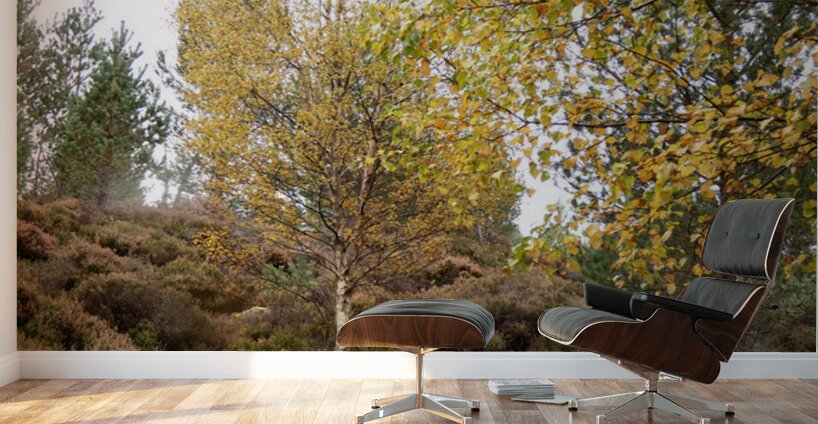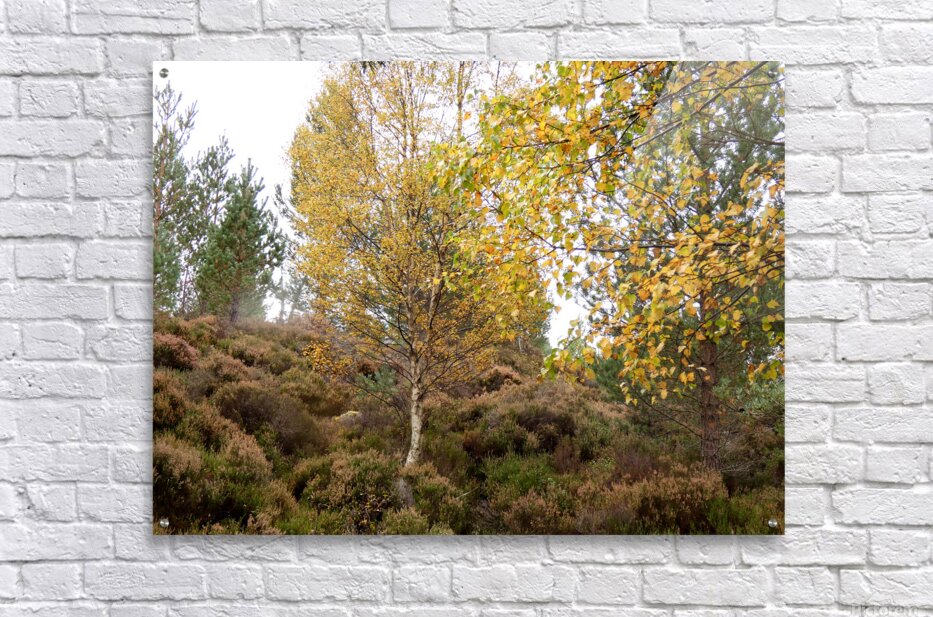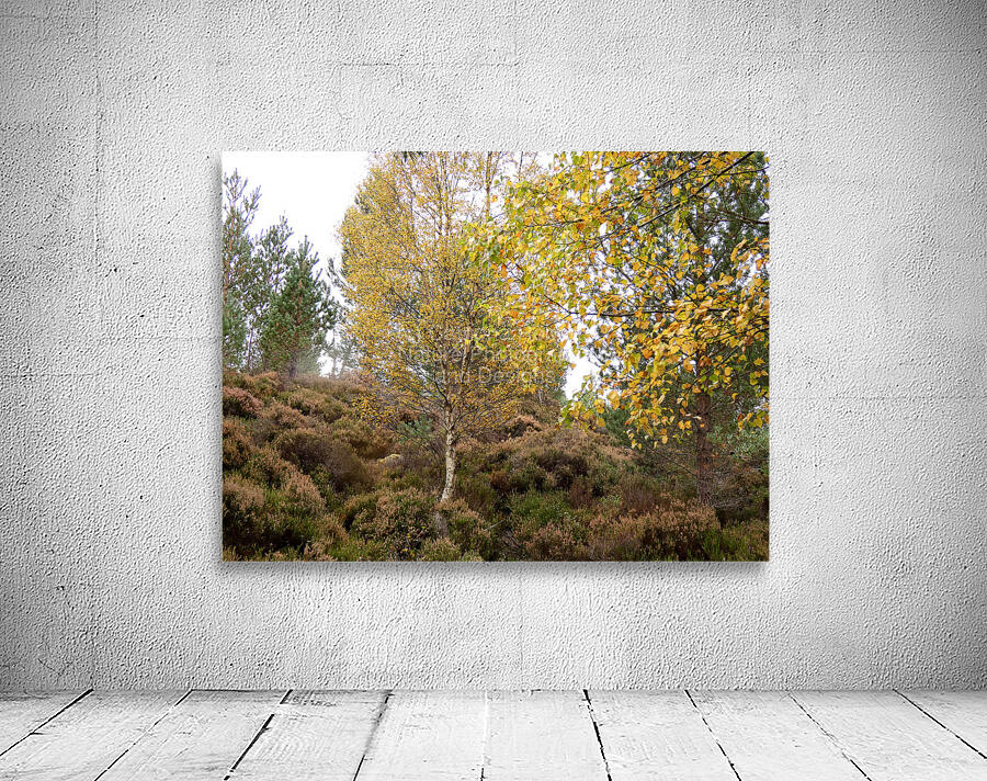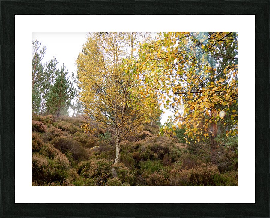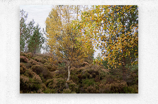 I took this photo during a lovely autumnal nature walk through the Scottish Highlands. Features a Birch tree with vibrant yellow leaves standing amidst a backdrop of lush green Pines, capturing the essence of a picturesque autumn scene. The ground is covered with dense Heather, adding a textured layer to the landscape.