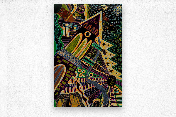 Originally a hand drawn composition created using coloured ink pens and paper, laterally digitally colour enhanced to create a stunning piece of contemporary art work. Features a vibrant and abstract depiction of a tilted tower contrasting against a chaotic background filled with swirling patterns, celestial shapes, and enigmatic symbols. Bold colors and dynamic lines create a sense of movement and energy throughout the composition.