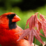 A northern cardinal looks directly into the lens of our camera with the red leaves of a japanse maple filling the rest of the frame.