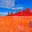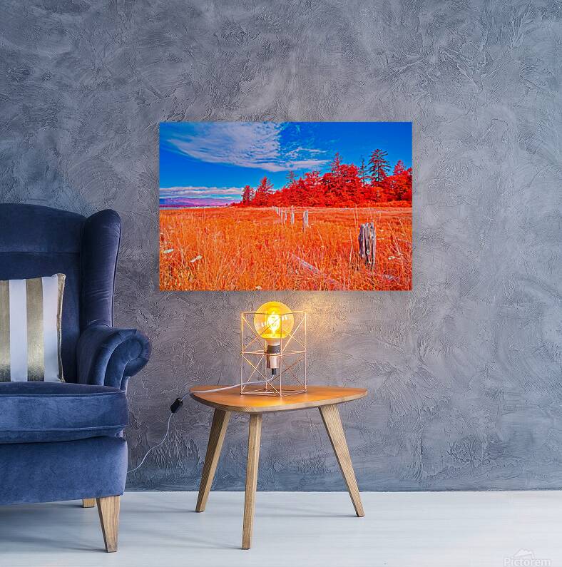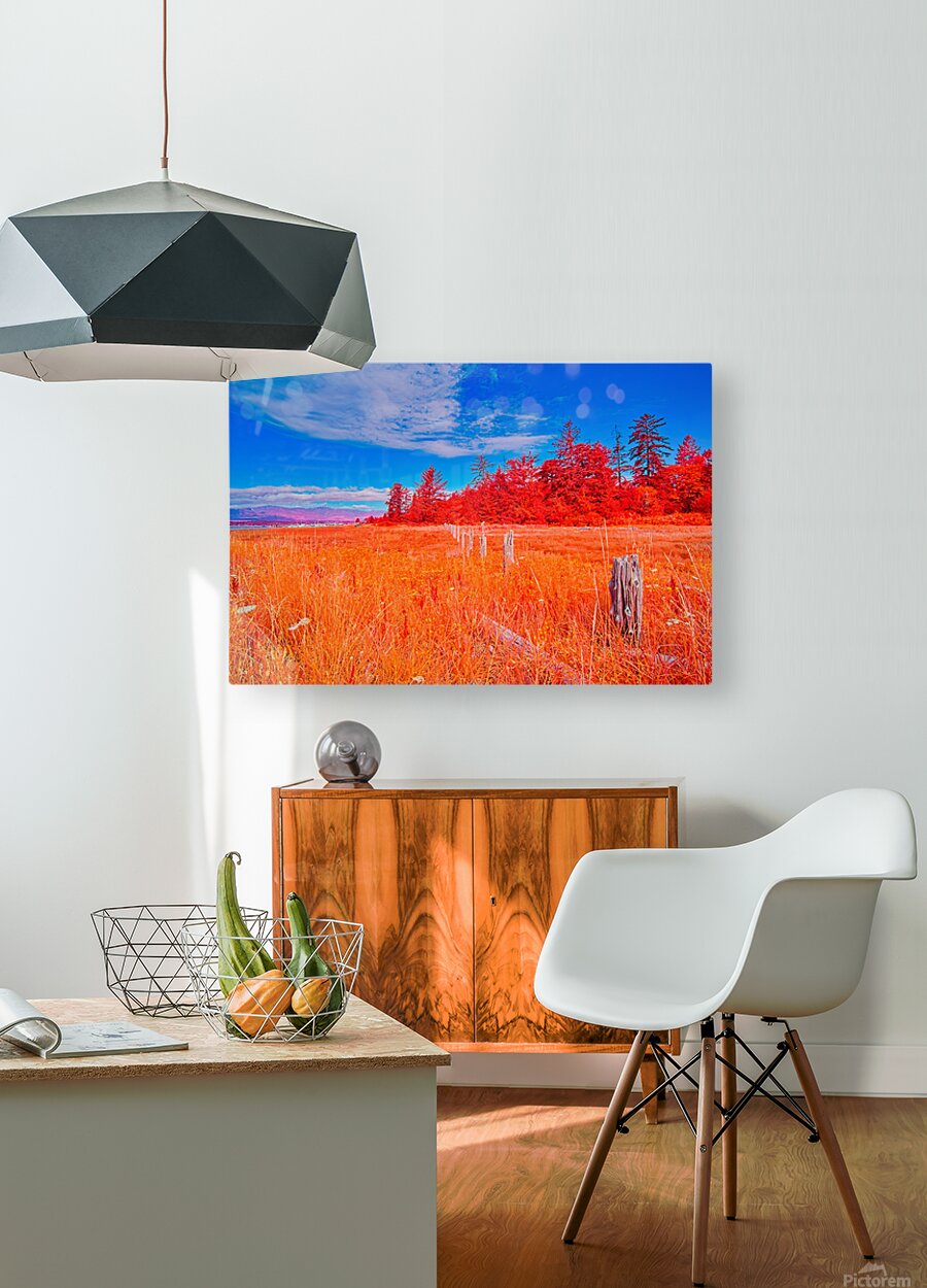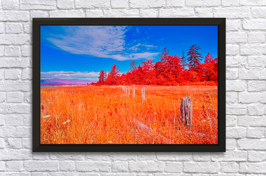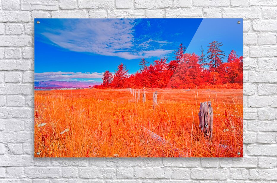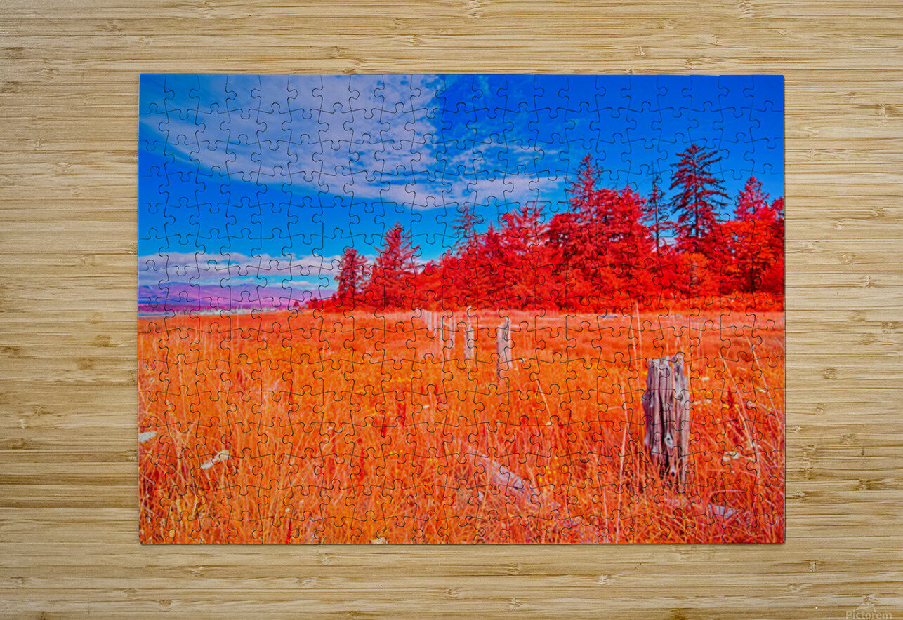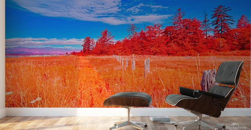 A vibrant landscape features bright red foliage and grasses set against a deep blue sky, creating a surreal, dreamlike scene. Weathered wooden posts s...[+]