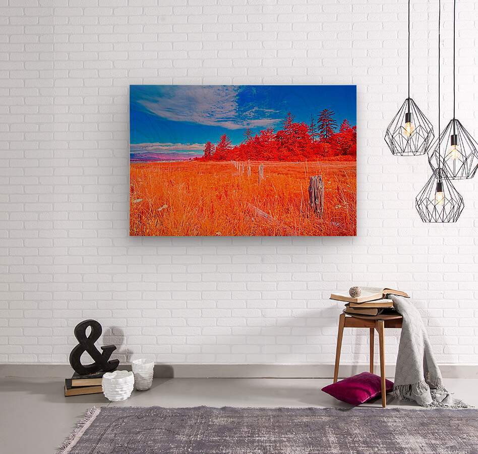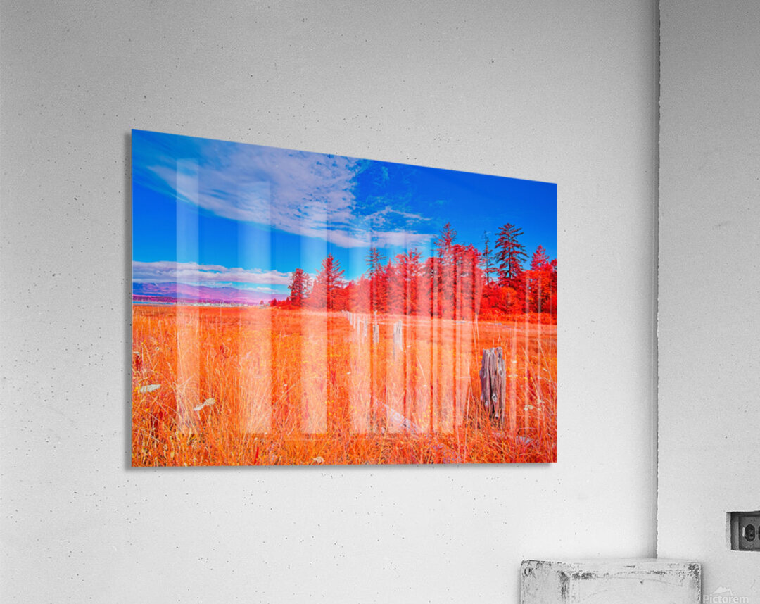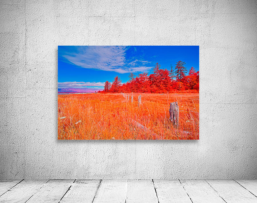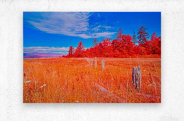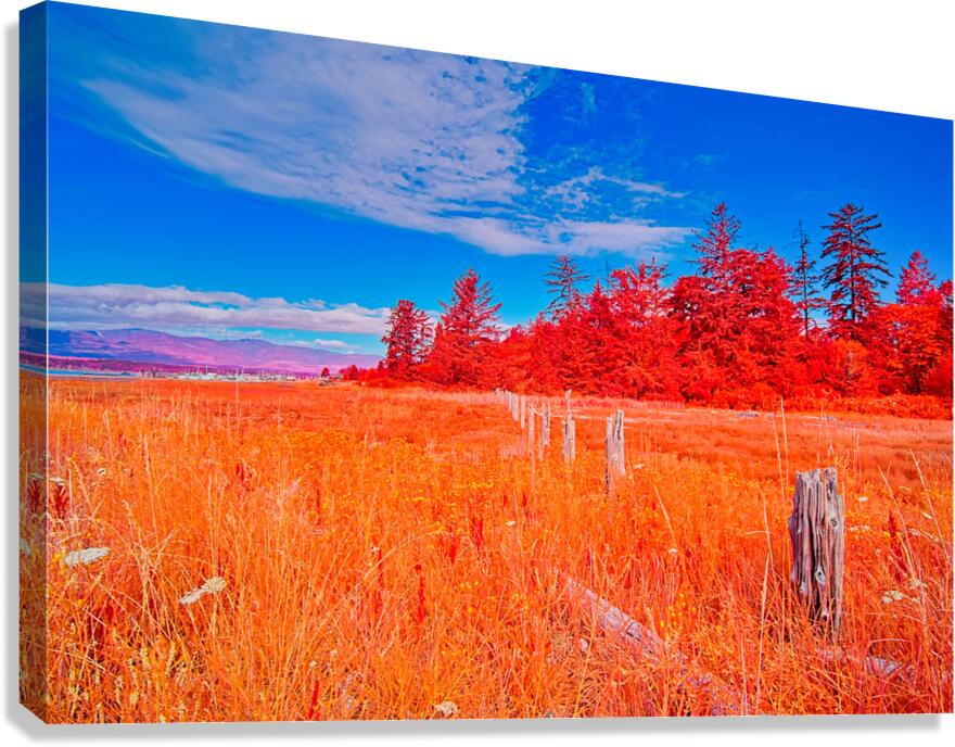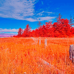 A vibrant landscape features bright red foliage and grasses set against a deep blue sky, creating a surreal, dreamlike scene. Weathered wooden posts stand in the open field, leading the eye toward a distant treeline. The image was taken with a full spectrum camera and a Kolari Vision Chrome Infrared filter.