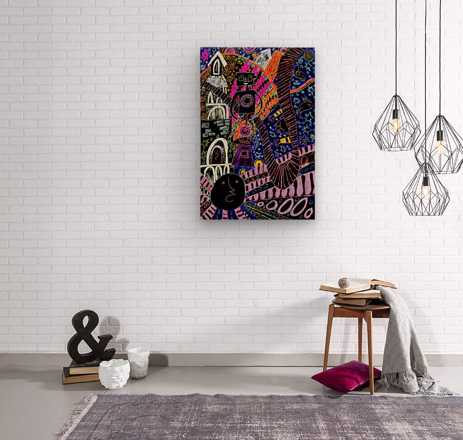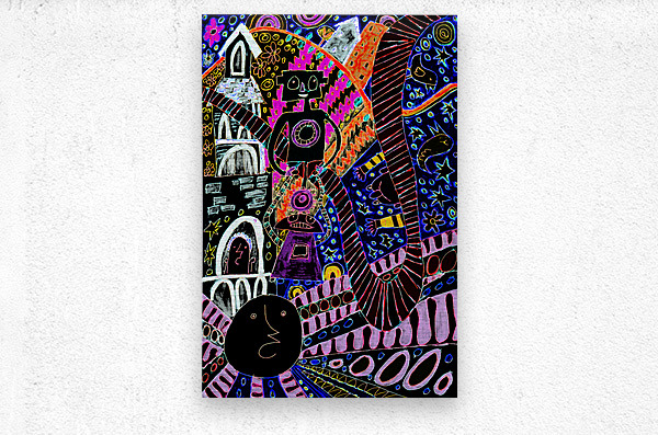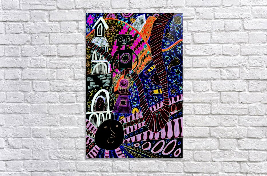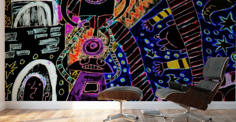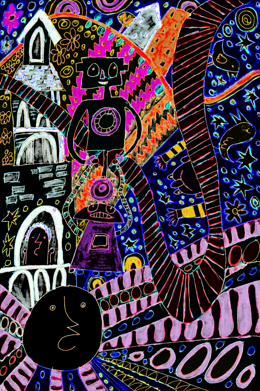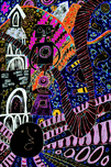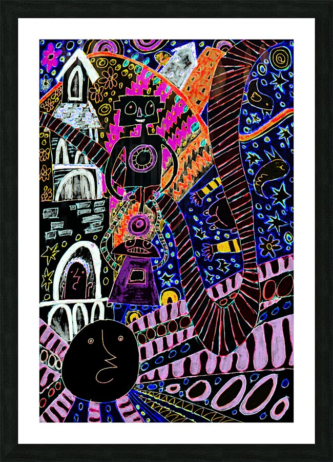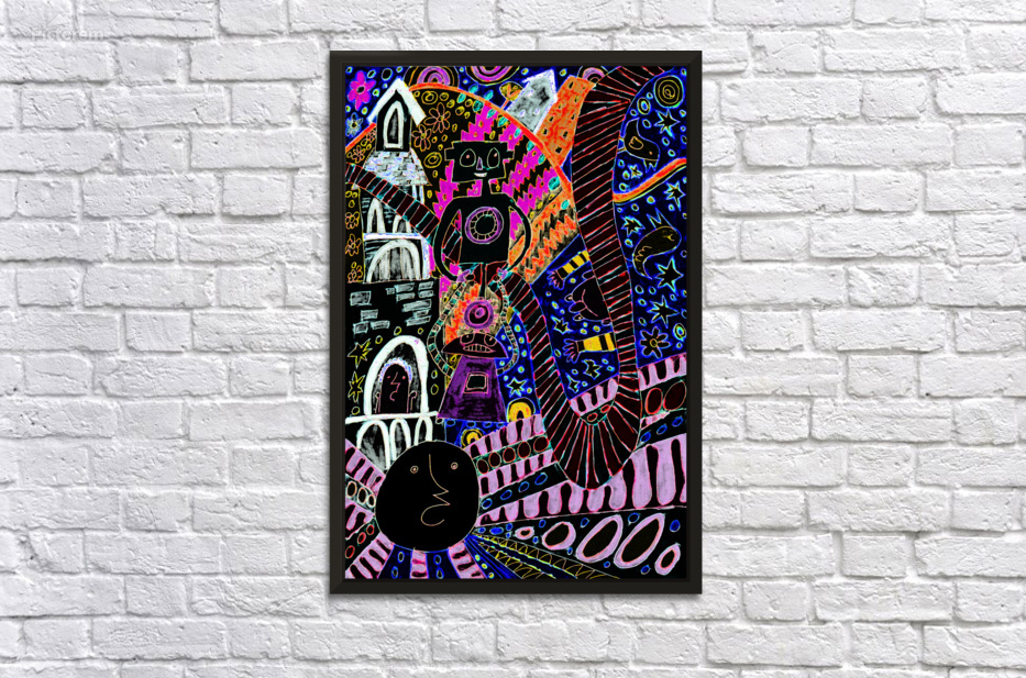 Originally a hand drawn design created using coloured ink pens and paper, laterally digitally coloured enhanced to create a stunning piece of contemporary art. Features brightly colored patterns and shapes which fill the image, creating a lively and chaotic scene. Robots stand prominently among swirling lines and geometric structures, surrounded by stars and abstract faces.