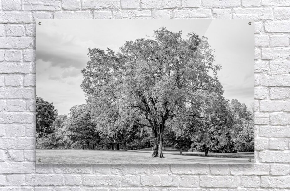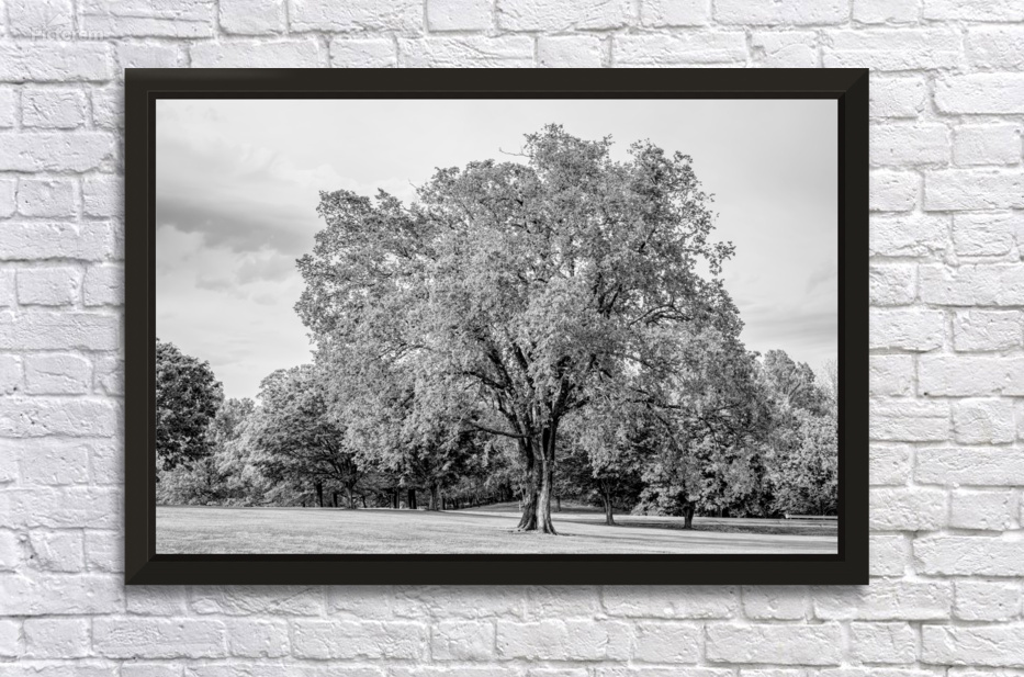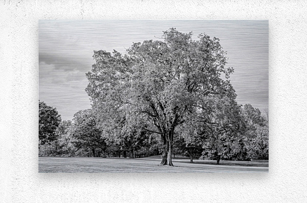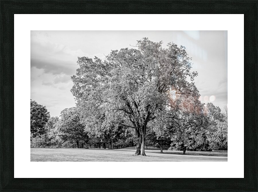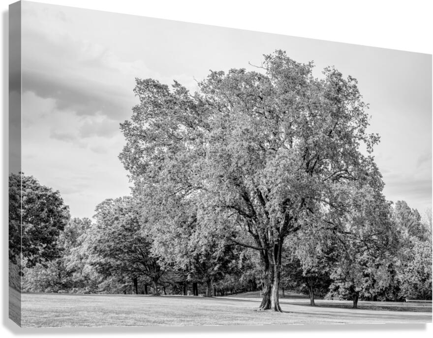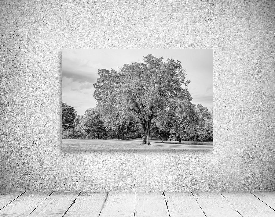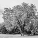 This landscape black and white photograph features a stunning, mature elm tree standing proudly in the center of an open field at Springfield Lake Park in Springfield, Missouri, United States. Captured on a quiet spring evening, the peaceful atmosphere and soft natural light highlight the tree’s expansive canopy and textured trunk. Though the specific species is unknown, this elm belongs to the Ulmaceae family and Ulmus genus. These trees are often susceptible to Dutch elm disease, making the presence of such a large and healthy specimen all the more remarkable. A serene moment in nature showcasing the strength and beauty of this enduring tree. This photo was taken by Jennifer White with Timeless Moments Photography. All images are copyrighted © Timeless Moments Photography/Jennifer White. All rights reserved. Please note the watermark does not print on ordered products.