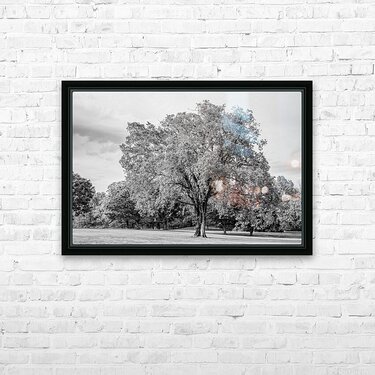 This landscape black and white photograph features a stunning, mature elm tree standing proudly in the center of an open field at Springfield Lake Par...[+]