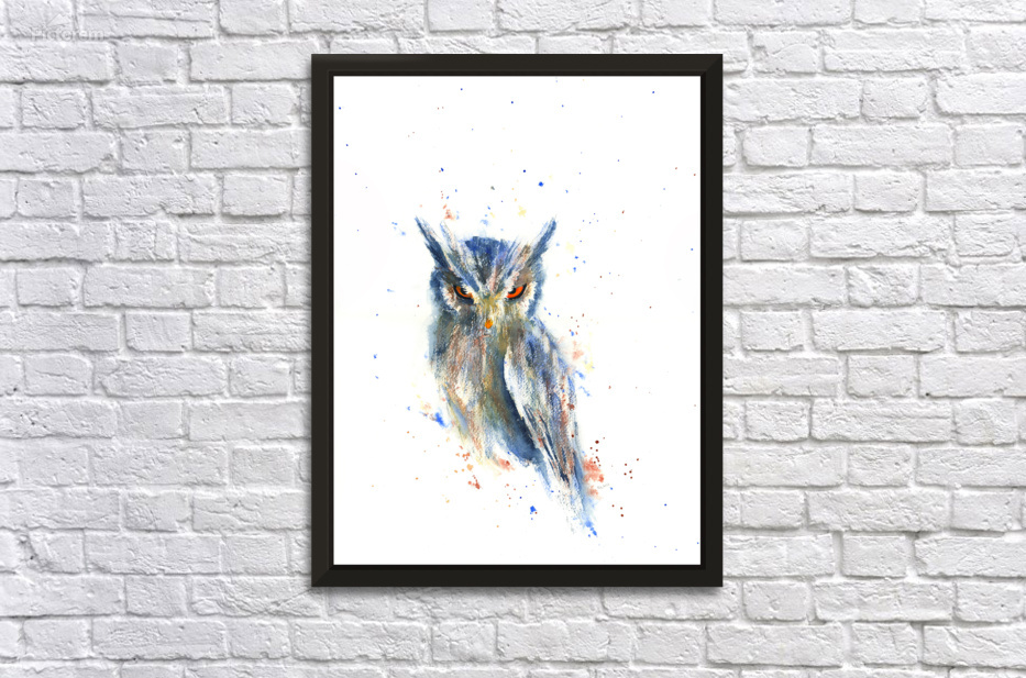I am watching you is a watercolor painting in portrait format painted by the artist Karen Kaspar. An owl is sitting on a branch. It has lowered its head and looks at the viewer with a penetrating gaze from its bright orange eyes. The plumage is painted with loose brushstrokes in shades of blue and brown. The background is white with splashes of colour in the same shades as the owls feathers. Fine art prints and home decor from original artwork paintings and photography by artist Karen Kaspar. 452