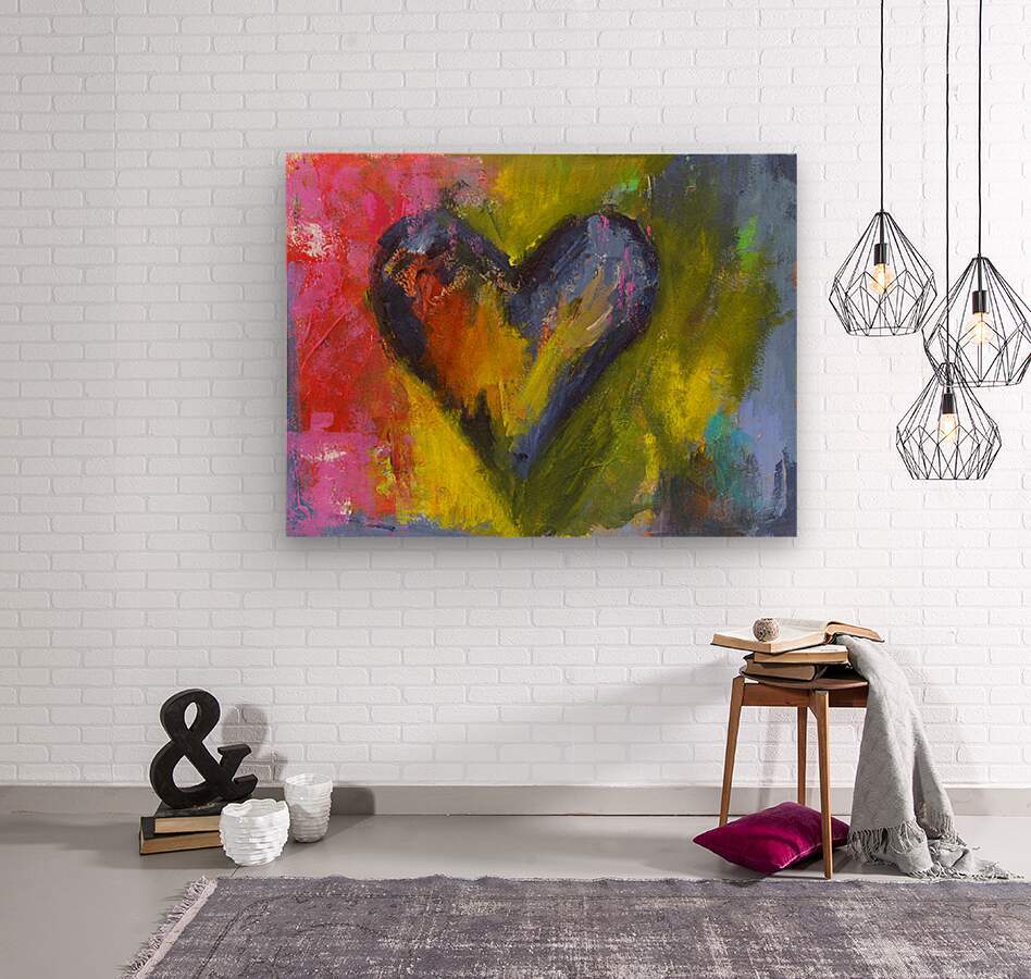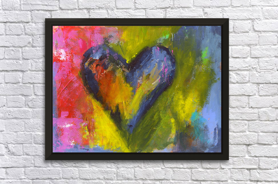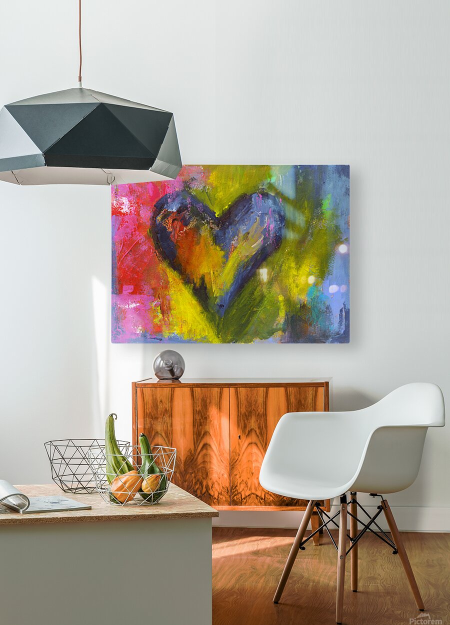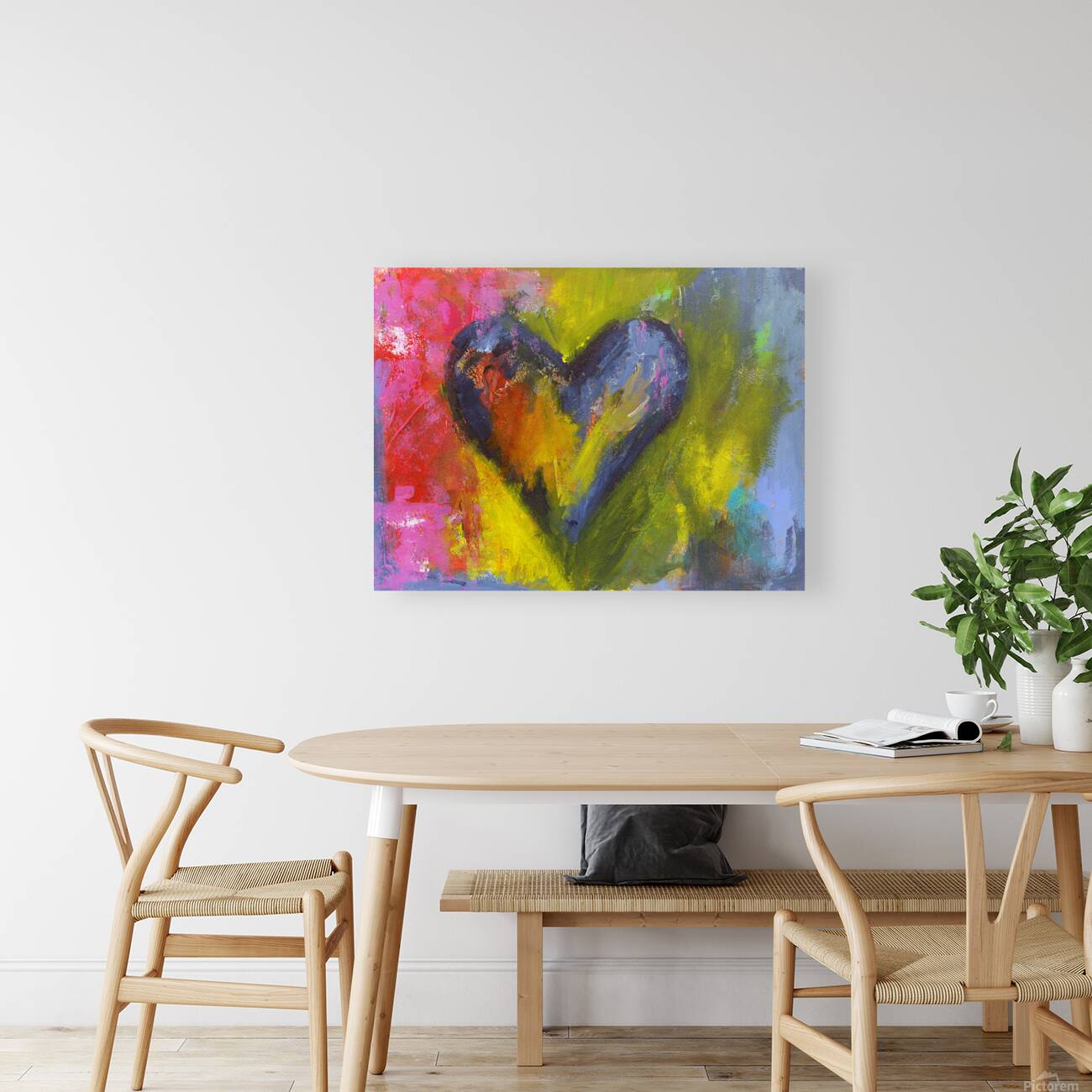 Indigo Heart is a contemporary abstract acrylic painting painted in landscape format by artist Karen Kaspar. It shows a heart shape against an abstract background. The heart is painted in all colors of the rainbow such as yellow orange red pink violet blue indigo and green. The background echoes these colors in various shades. The painting is painted with bold expressive brush strokes and the surface is textured by the partially pasty application of paint. Let your love shine in all colors. Fine art prints and home decor from original artwork paintings and photography by artist Karen Kaspar. 131