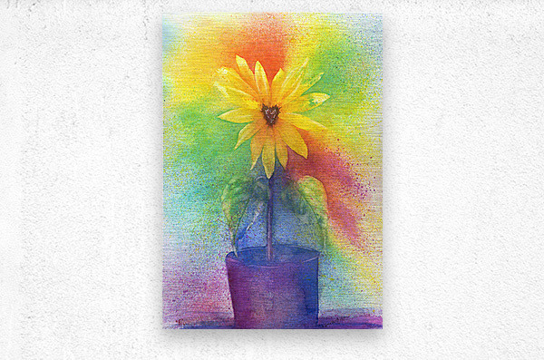 With love is a watercolor painting in portrait format hand-painted by artist Karen Kaspar. A beautiful sunflower blooms with a heart-shaped bloom of bright yellow and orange. The plant is planted in a blue-purple pot. The background is abstracted in bright colorful colors of the rainbow. With love from me to you - inspired by a heartshaped sunflower I discovered on a sunflower field, I painted this little flower stilllife with watercolor in vibrant shades of yellow, orange, red, green, teal, blue, pink and purple. All colors of the rainbow shining through. The perfect gift für a loved one, friends or family, valentines day or mothers day. 52