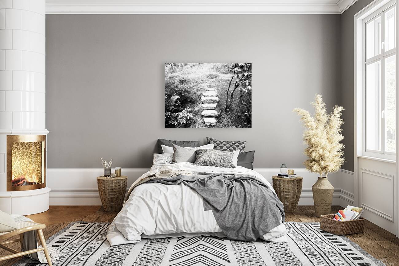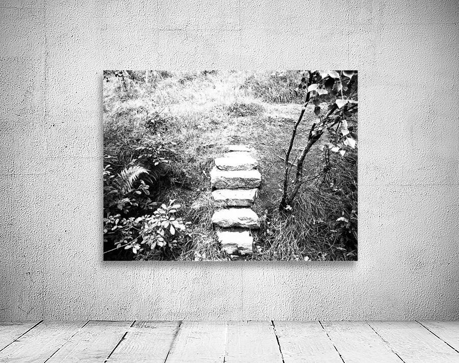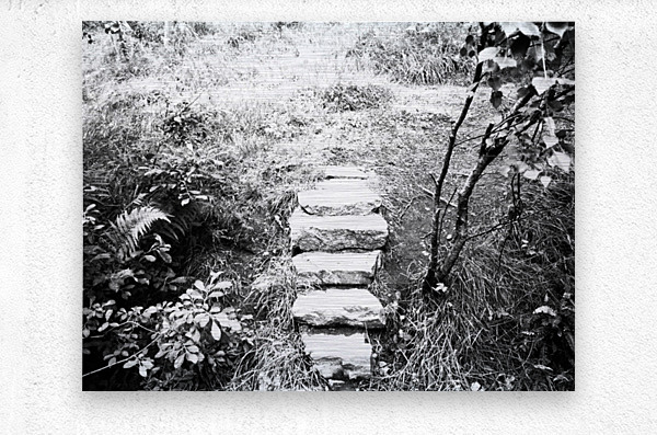 I took this photograph (using a monochrome photographic filter which gives a grainy effect when enlarged) during a lovely summer nature walk through the Scottish Highlands. Features a monochrome scene which captures a stone pathway leading through a tranquil forest setting, with light filtering through the trees. The contrast between the stones and the surrounding wild grasses creates a peaceful, natural atmosphere.