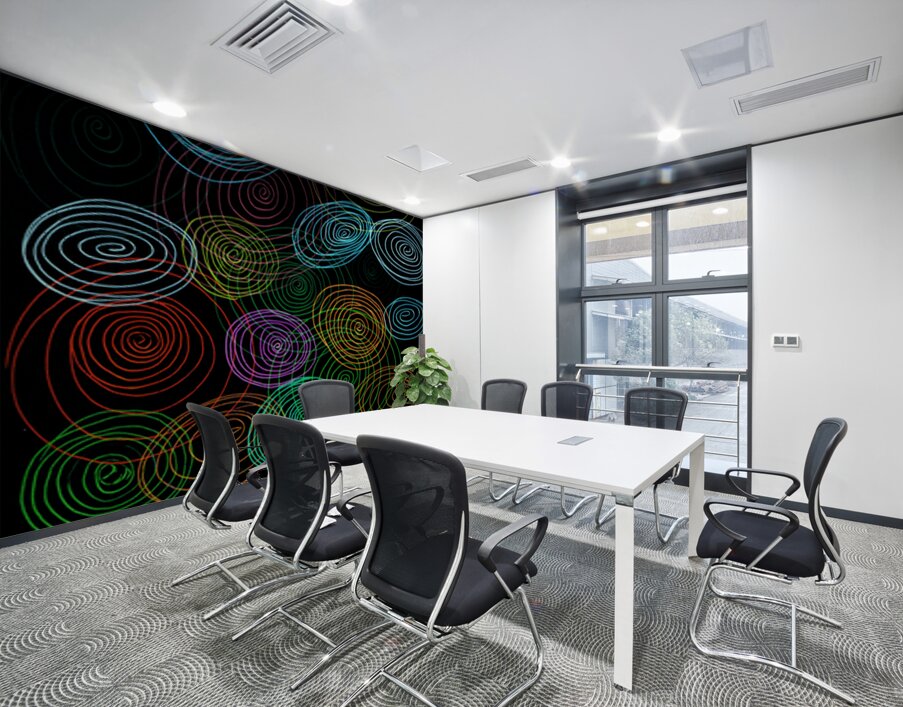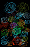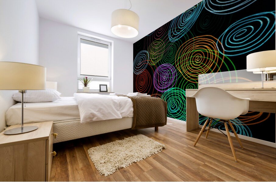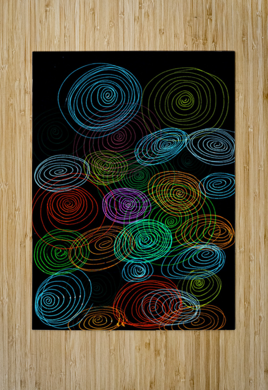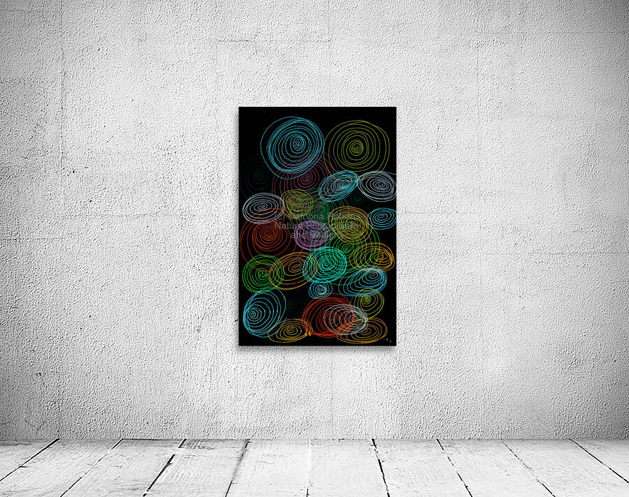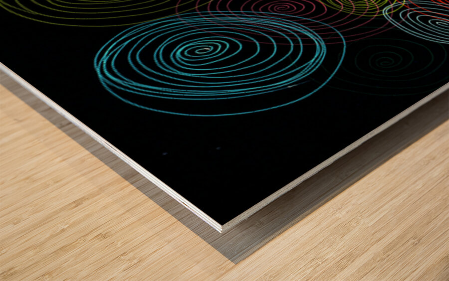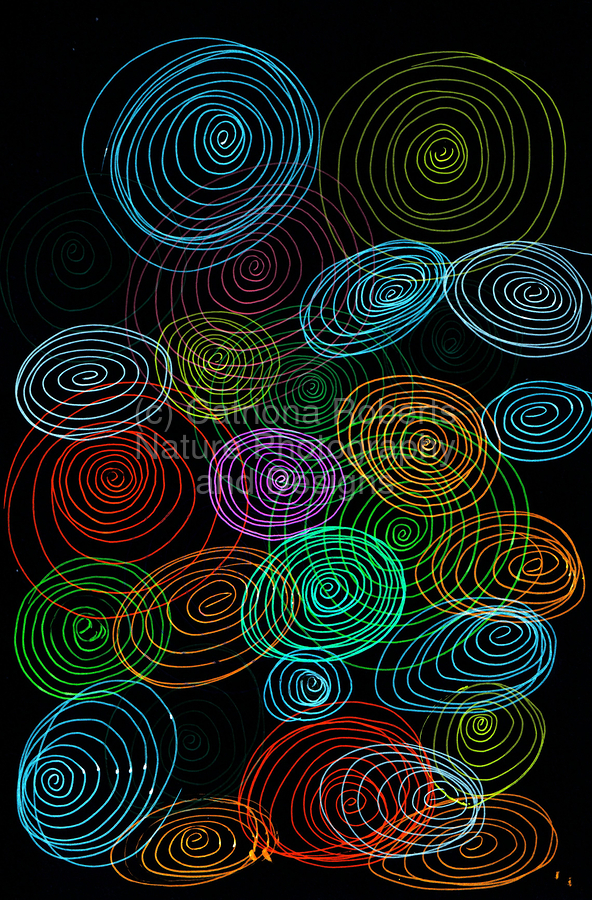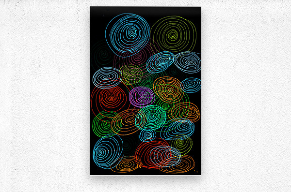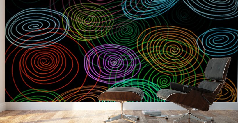 I originally drew this design using ink pens on white paper, laterally digitally editing the colours to create this contemporary piece of line art. Features vibrant swirling patterns in varying colors which fill the black background, creating an energetic and dynamic composition. These colorful spirals overlap and intertwine, producing a sense of depth and movement.