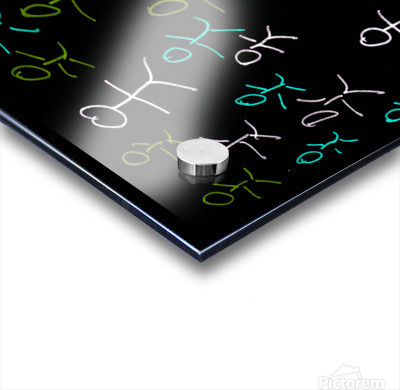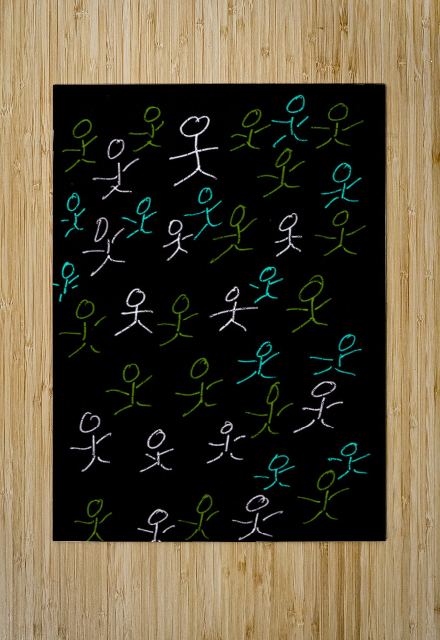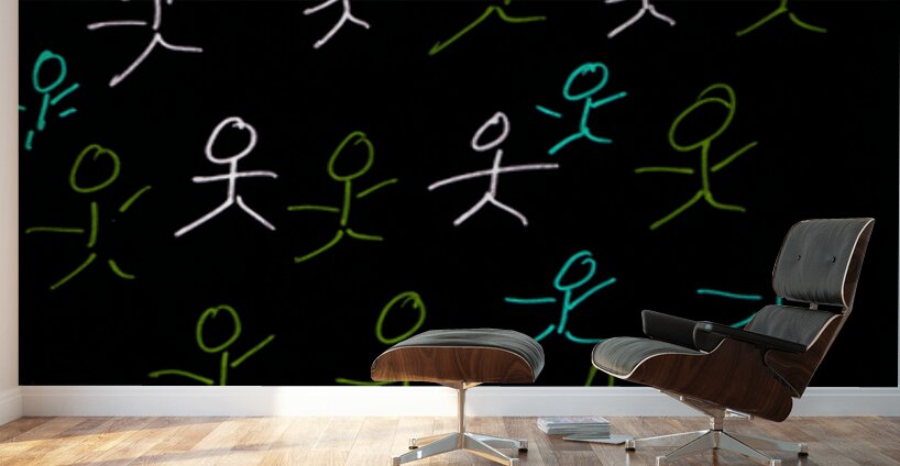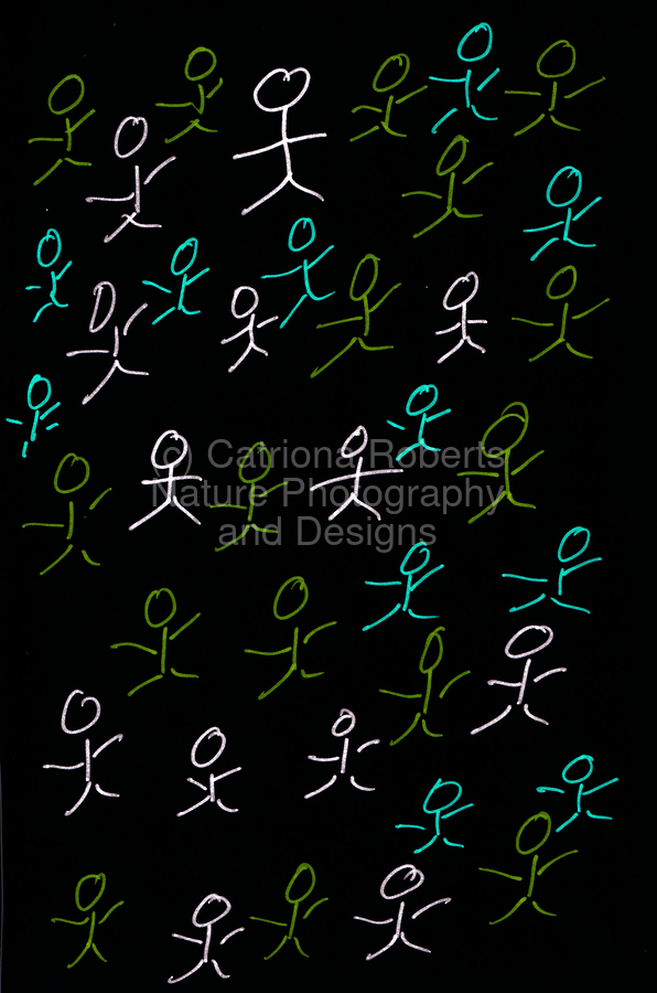 I originally hand drew this abstract doodle design using coloured ink pens and paper, laterally digitally editing the colours to create a modern piece of contemporary line abstract art. Features a collection of colorful stick figures arranged against a black background, showcasing a playful and abstract pattern. The figures are drawn in green, white, and blue, creating a lively scene.