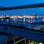 Long exposure night shot of the Elbe River seen through a concrete frame in Hamburg Germany