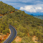 A winding road cuts through a lush hillside in Sedona Arizona offering a scenic route with views of the distant landscape and cloudy skies. The road p...[+]