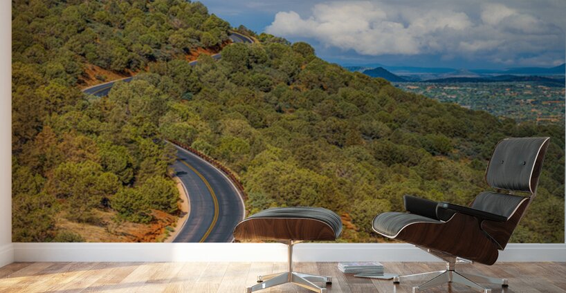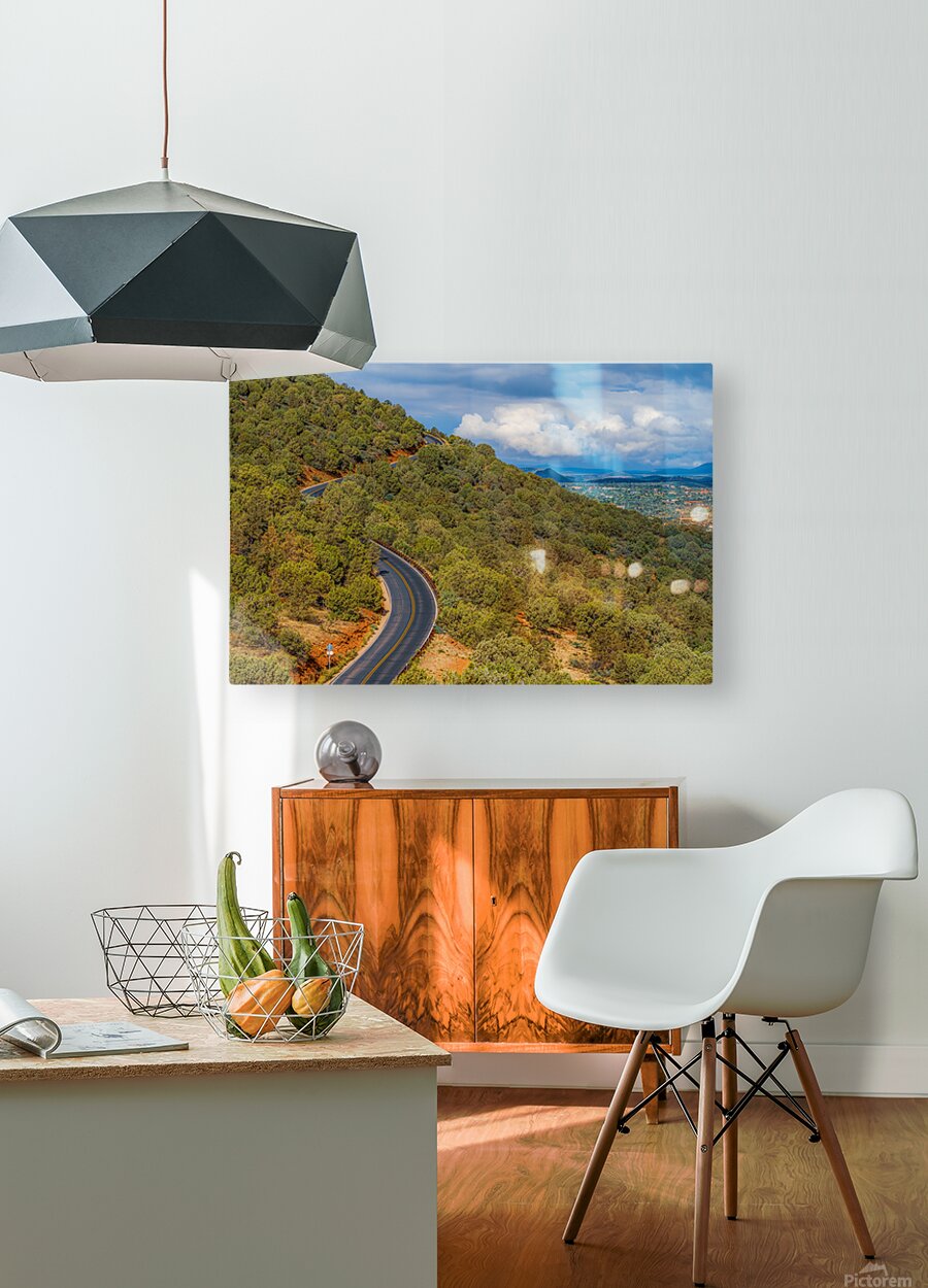 A winding road cuts through a lush hillside in Sedona Arizona offering a scenic route with views of the distant landscape and cloudy skies. The road provides access to the community nestled in the valley below.
