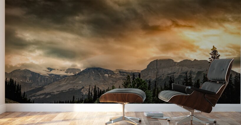 Canadian Rock Mountains in Banff National Park viewed from along the Icefields Parkway. Sunset storm clouds are framing the mountain peaks over Mount Erasmus during a summer of wildfires creating stunning orange multi-colored clouds from micro-particles in the sky landscape. The Icefields Parkway, a UNESCO World Heritage Site, is dotted with over 100 ancient glaciers, dramatic rock spires, and emerald lakes set in sweeping valleys of thick pine and larch forests. This already stunning scenery becomes even more captivating as the sun sets, casting long shadows and painting the peaks like Mount Erasmus in an unforgettable display of color and light.