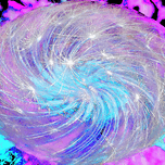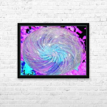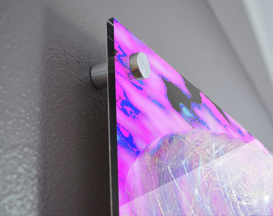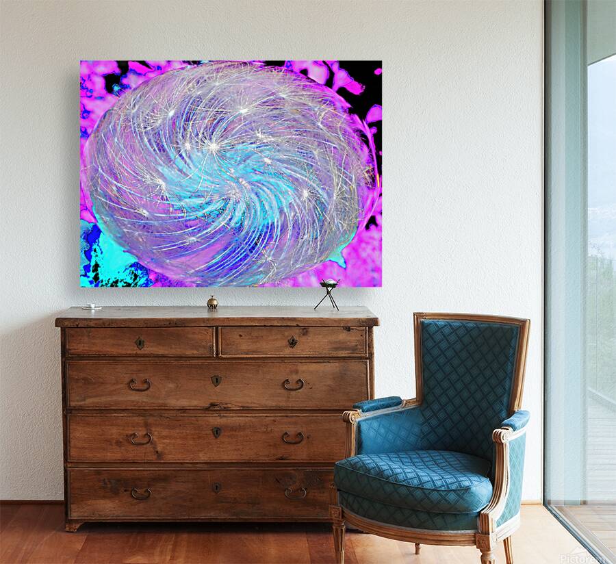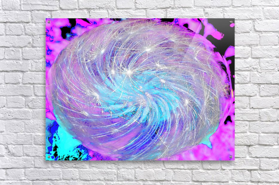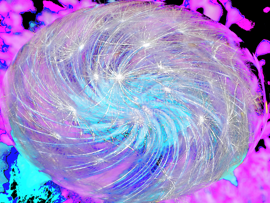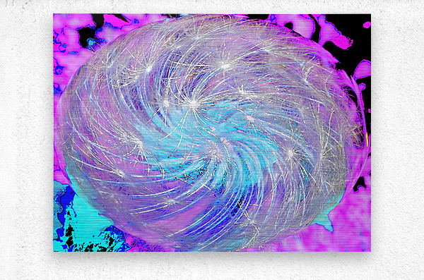I took a close up photo of Dandelion seeds laterally digitally edited using various creative filters to create this stunning piece of contemporary art. Features a swirling mass of light strands creating a mesmerizing, cosmic effect against a vibrant pink and blue background. The image has a dynamic, otherworldly quality, reminiscent of a galaxy or a nebula or even Dandelion seeds.