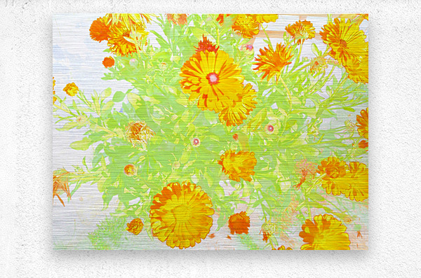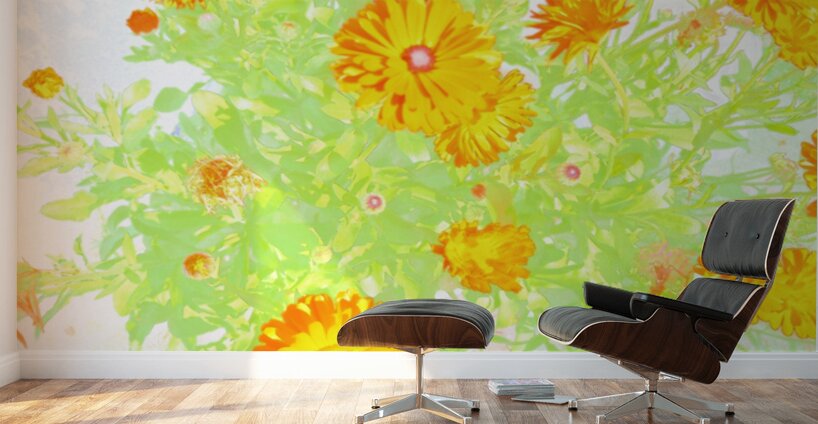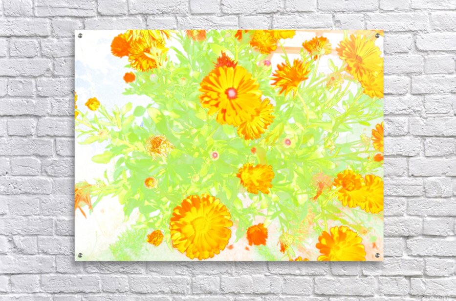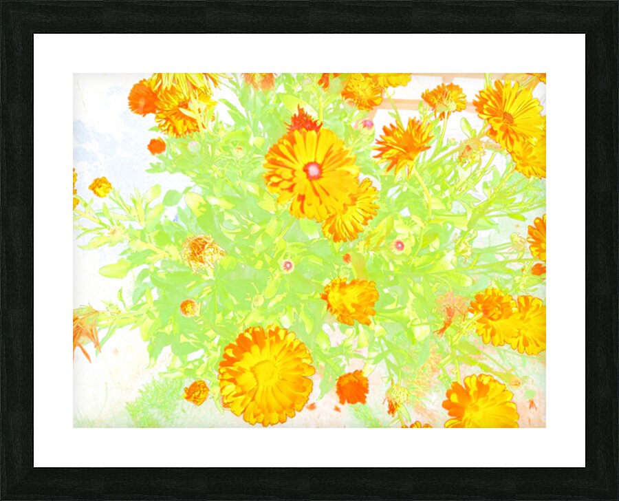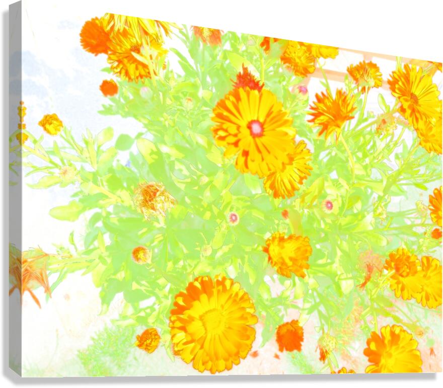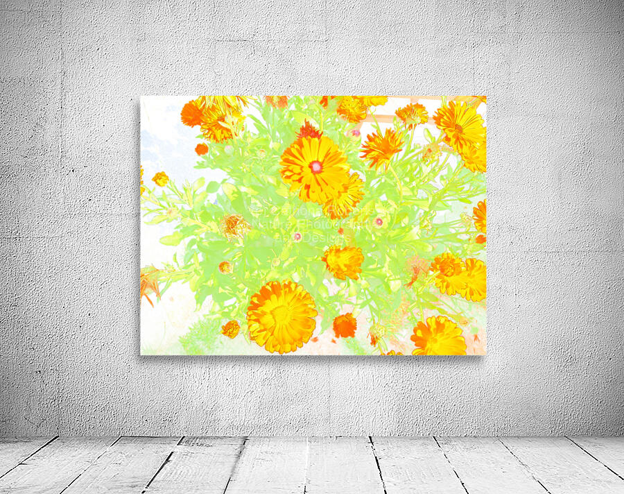 I took this photo, using a creative photographic filter, during a lovely summer day. Features brightly colored orange flowers standing out against a light, ethereal background, creating a vibrant display with a touch of whimsy. The green leaves enhance the vividness of the petals, adding depth and freshness to the composition.