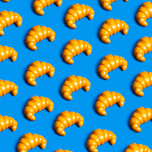 A vibrant pattern of plastic croissants against a blue background symbolizing the clash between junk food consumption and diet culture in modern socie...[+]