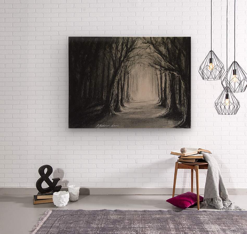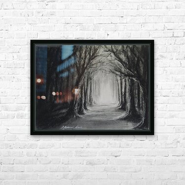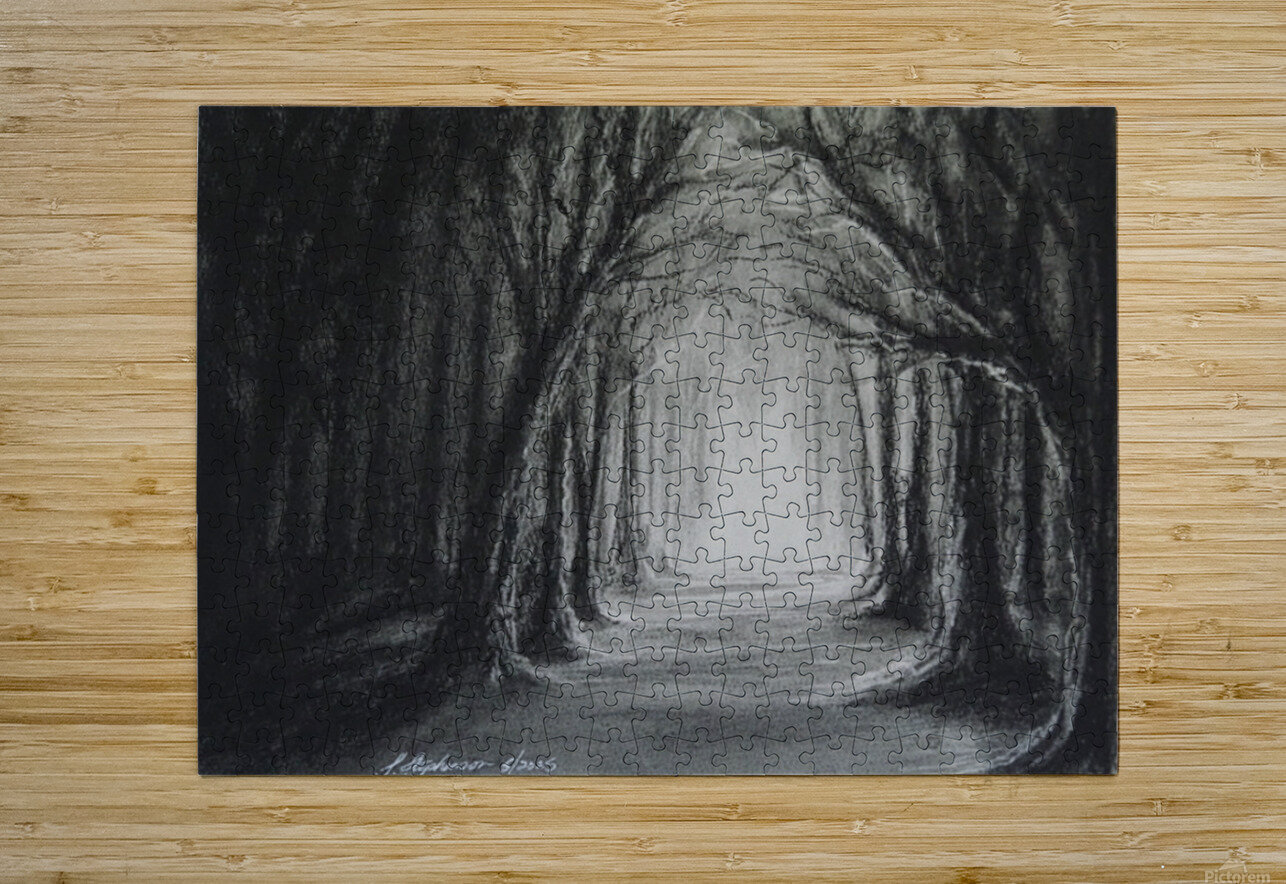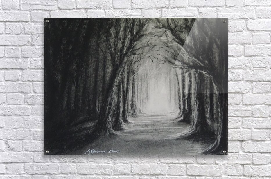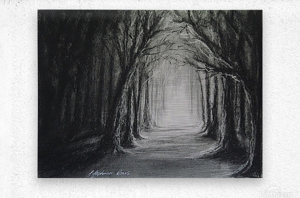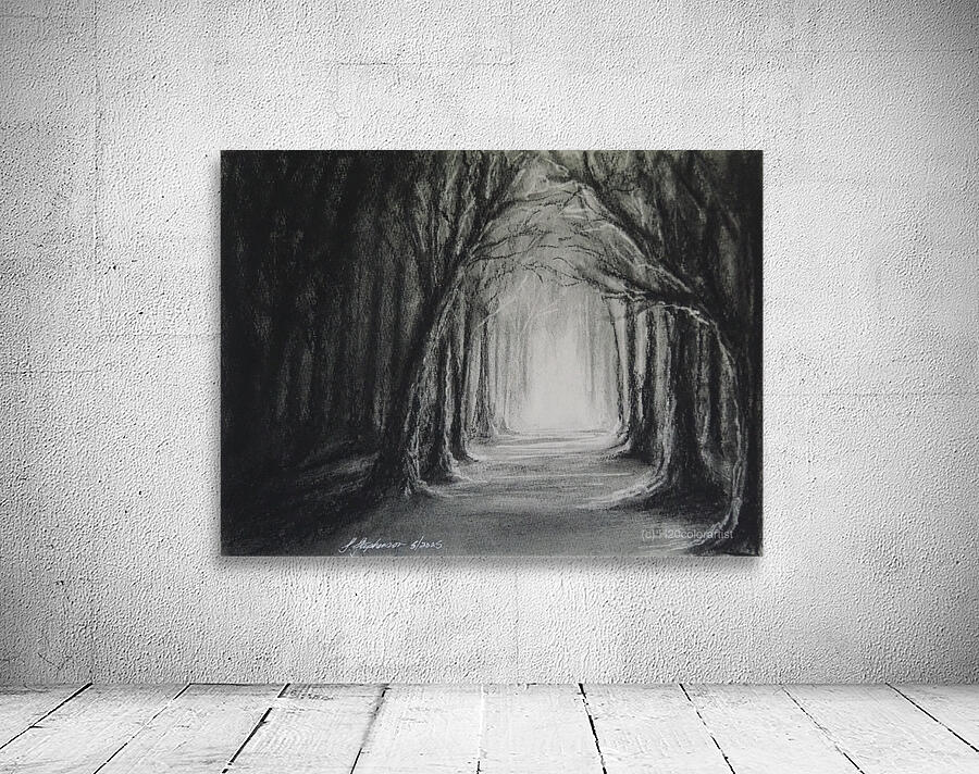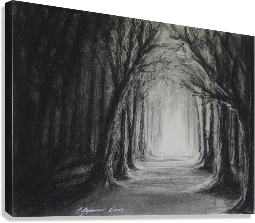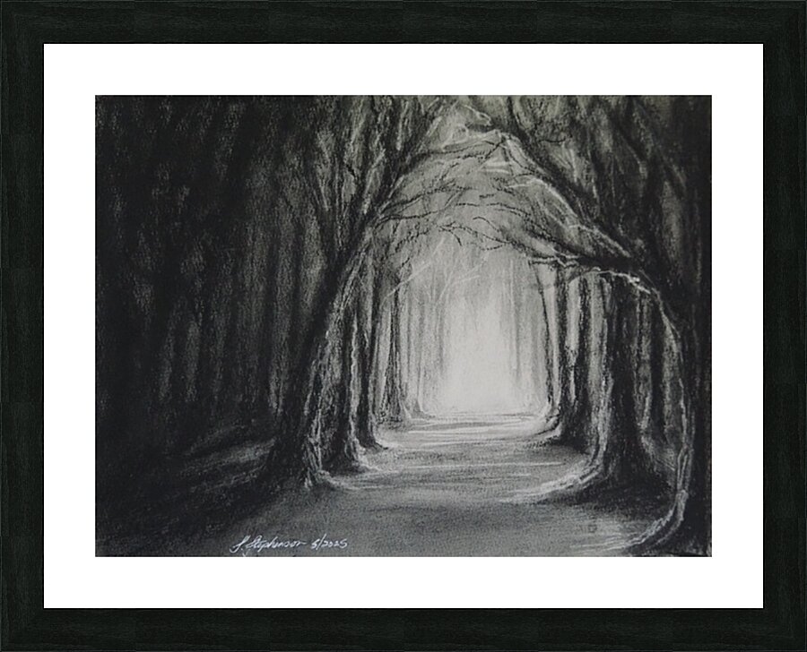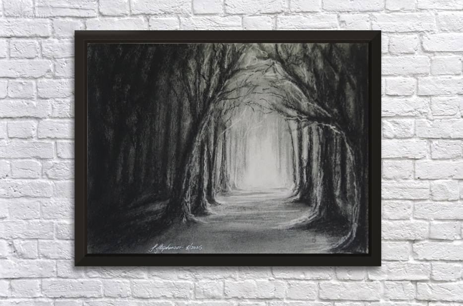 Almost There is a charcoal drawing that depicts an unknown traveler on a dark path heading towards a light depicting that they may be emerging from th...[+]