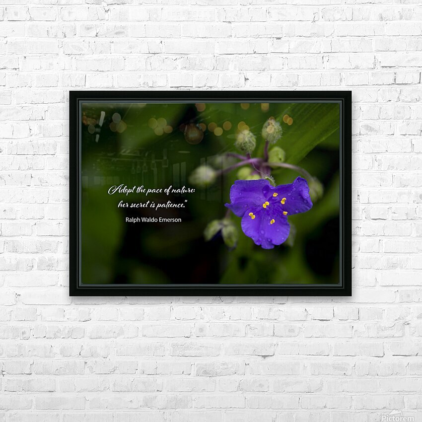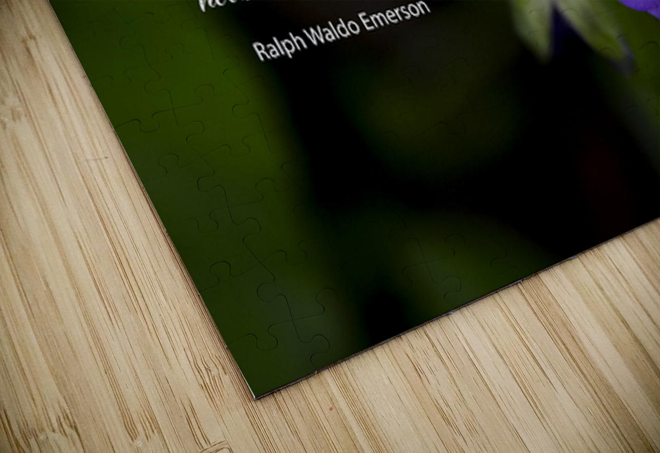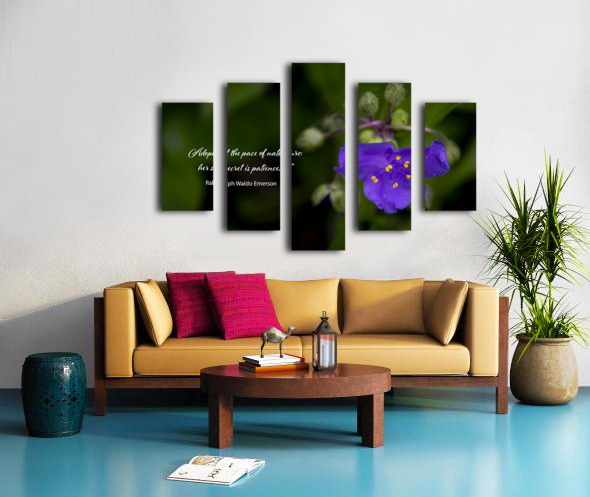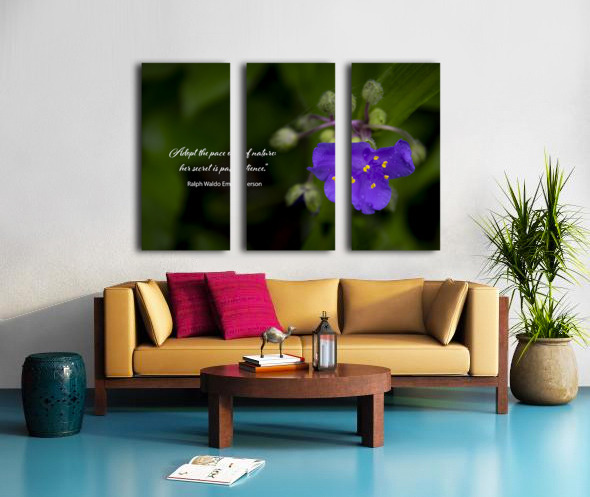 Adopt the pace of nature: her secret is patience.” ~ Ralph Waldo Emerson, a beloved quote is pictured on greenery with a a purple Spiderwort wildflower. Suitable for a wall hanging, puzzle. clock or in other applications.